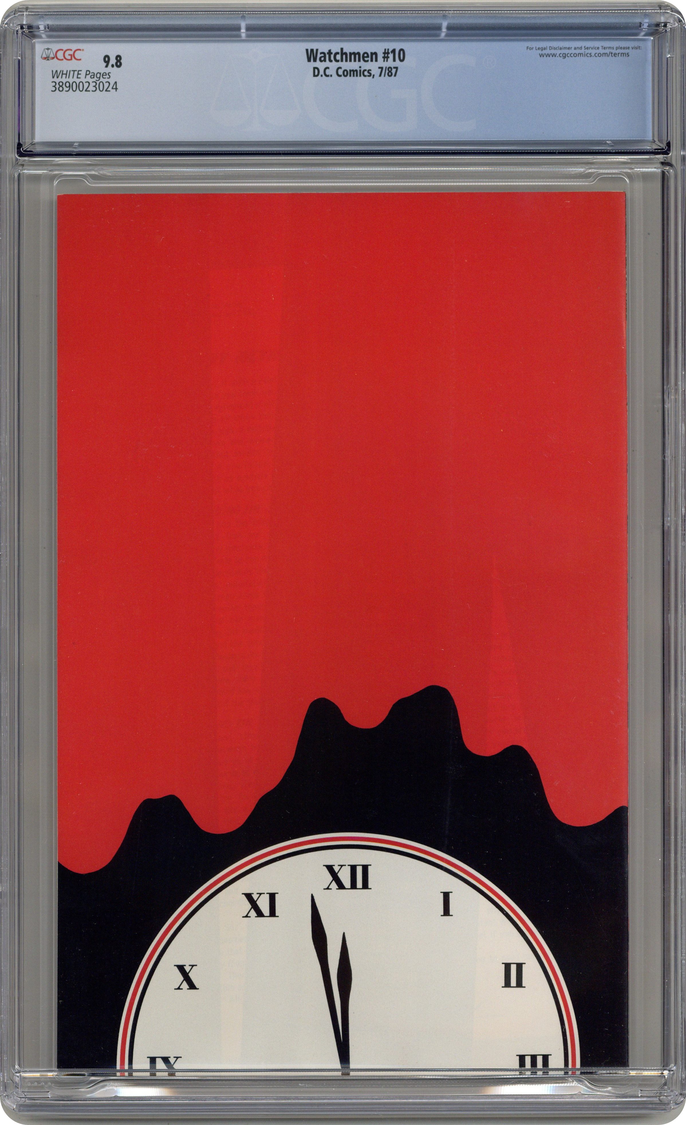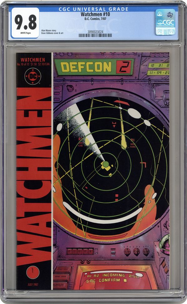 "Two riders were approaching". Part 10 of 12. Story by Alan Moore. Art and cover by Dave Gibbons. Rorschach and Night Owl continue their detective work and finally discover who is behind the conspiracy. This is not a good thing. Includes four page fictional text feature with a view of Adrian Veidt's scrapbook. 32 pages. Full color. No ads. Cover price $1.50. Grade: CGC 9.8 explanation of grade Condition: Used (collectible)