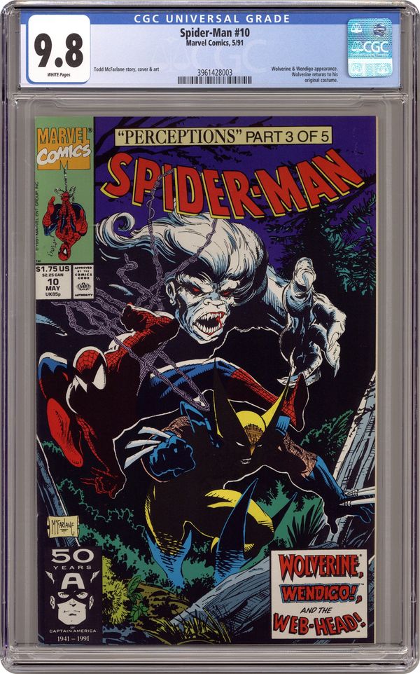 Direct Edition. Perceptions Part 3 of 5. Guest-starring Wolverine. Script and art by Todd McFarlane. Cover by Todd McFarlane. In the middle of the woods, a group of Mounted Police runs into the Wendigo! And as expected the powerful beast savagely tears into the Mounties. But luckily for the RCMP, Wolverine isnearby! And round one between Wolverine and the Wendigo commences! After the furious fight, Logan heads into town and finds an ally: Peter Parker! Later that evening, the wall-crawler and Wolverine meet in the forest to compare notes on the case. Is it possible that the Wendigo is not responsible for the children's deaths? The plot thickens. (Note: Rob Liefeld, Jim Lee, Scott Williams, and Rick Magyar contributed inks to this issue.) 32 pages. Cover price $1.75. Grade: CGC 9.8 explanation of grade Condition: Used (collectible)