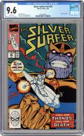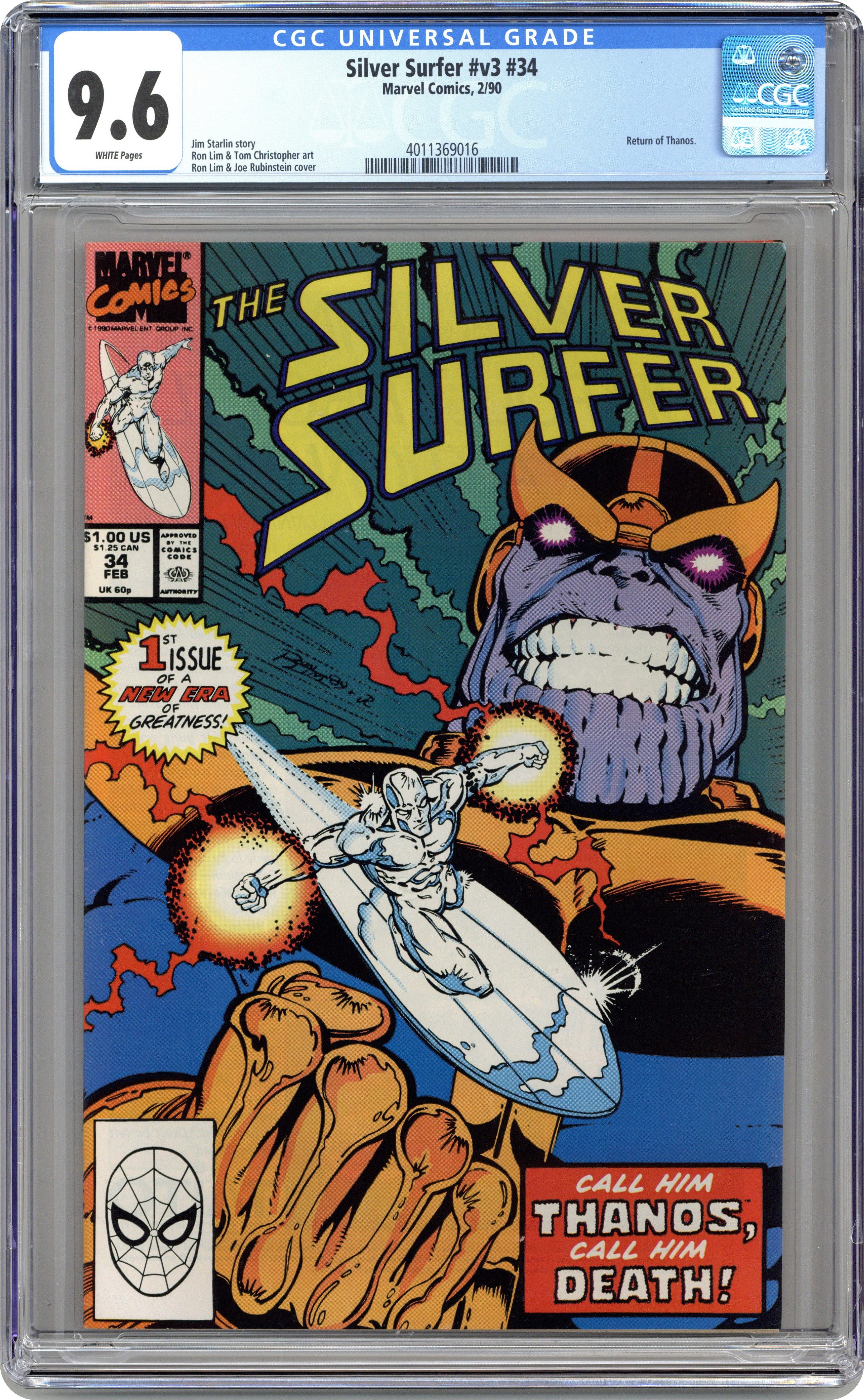 Direct Edition. Infinity Gauntlet: Prelude - Rebirth of Thanos: Part 1 of 5 - "...Even Demigods must Dream!" Featuring the return of Thanos. Story by Jim Starlin. Art by Ron Lim and Tom Christopher. The Silver Surfer tours the realm of Death. And, by story's end, witness the triumphant return of one of the Marvel Universe's most dangerous villains, the Mad Titan, Thanos. 32 pages.