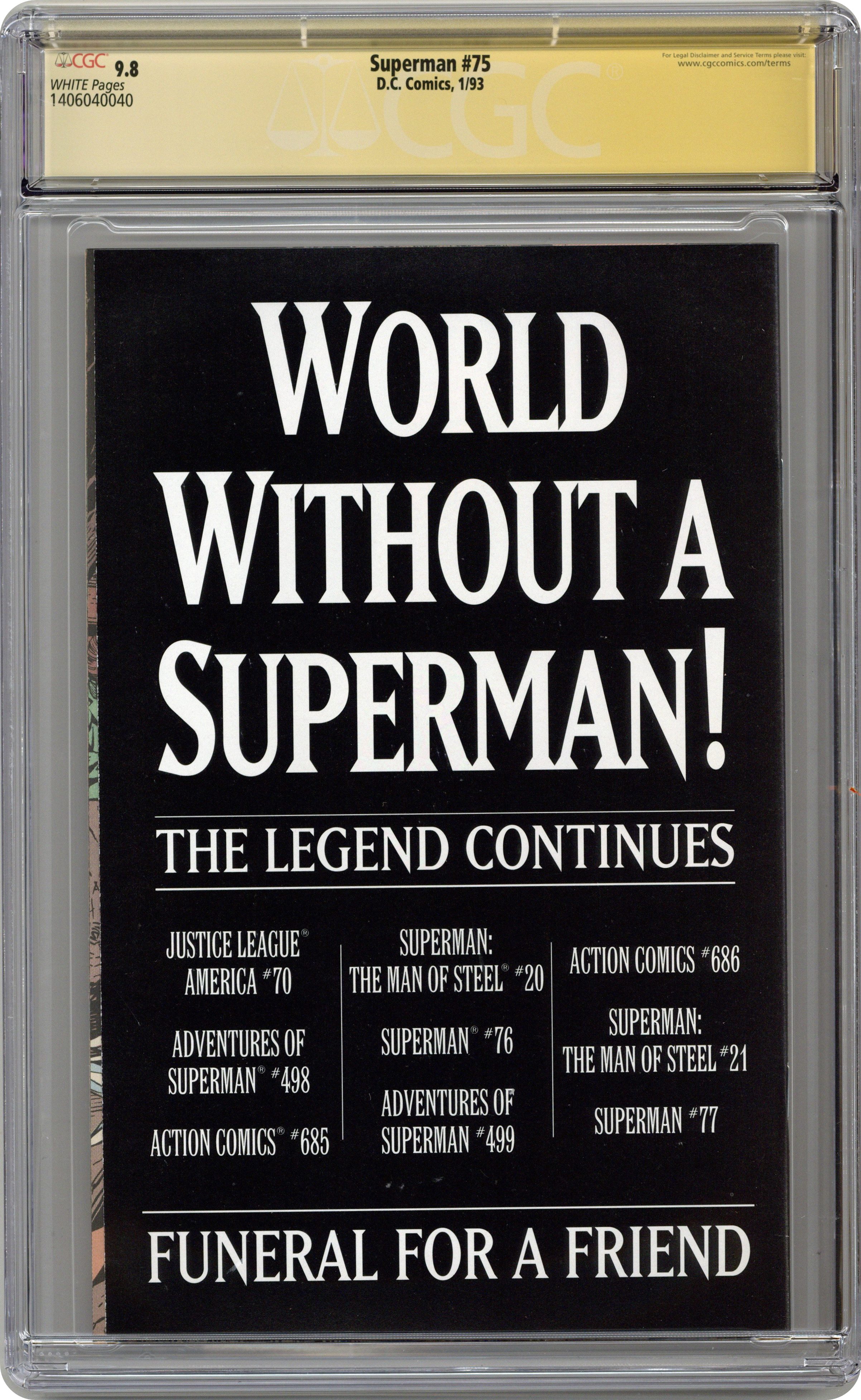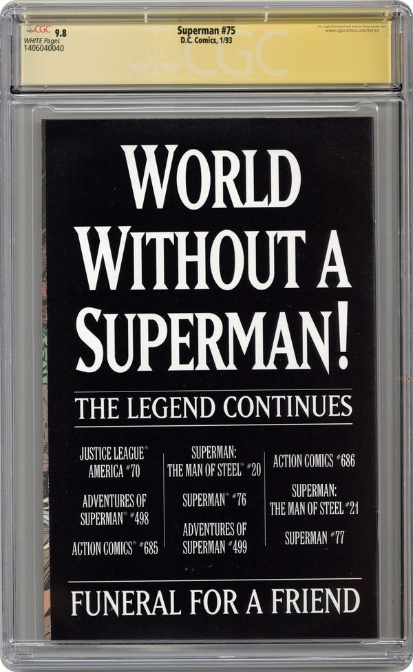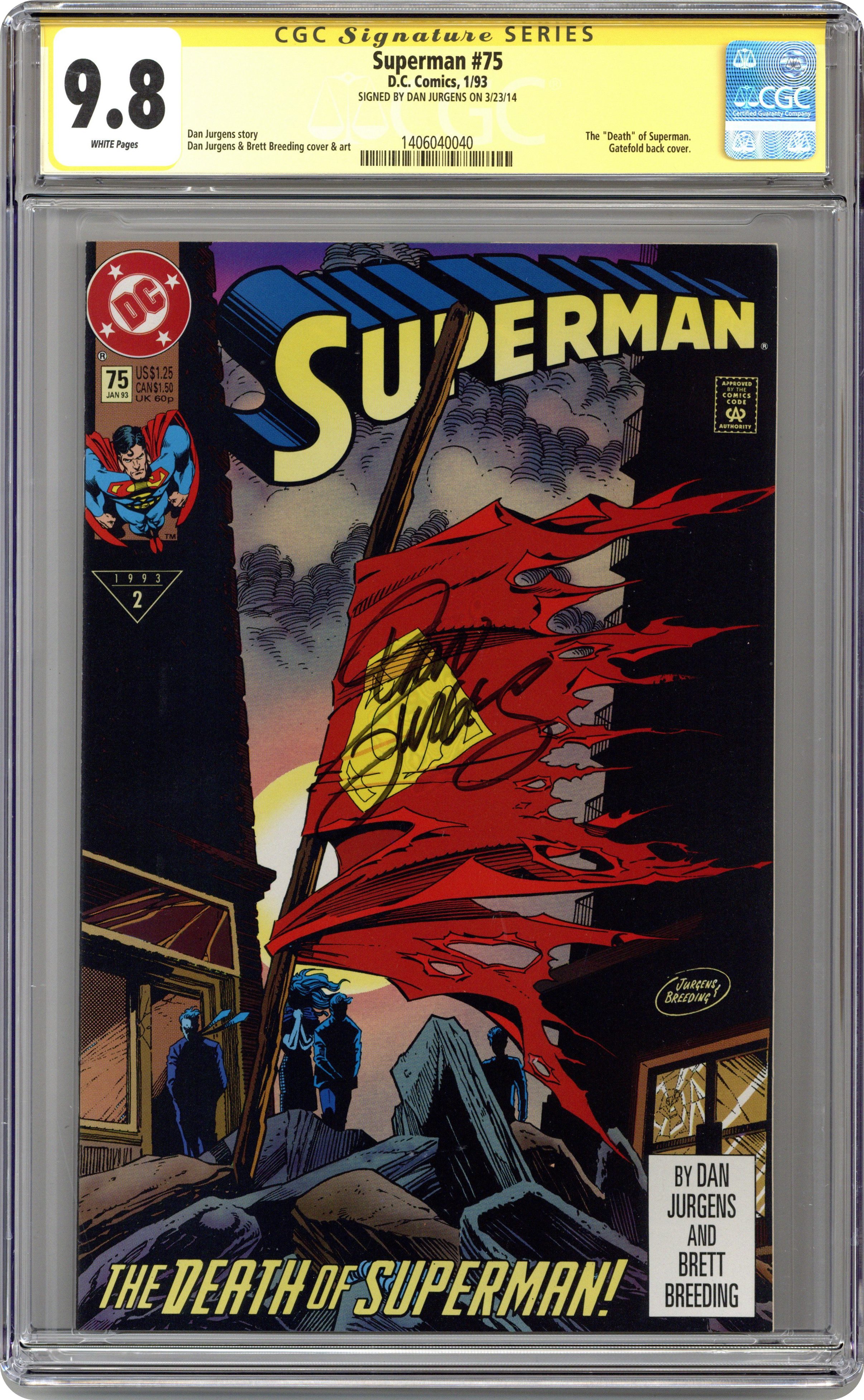 1st printing. Doomsday! Part 7 of 7. "Doomsday!" Story by Dan Jurgens. Art by Dan Jurgens and Brett Breeding. Here it is, the issue that rocked the DC Universe. An unstoppable force named Doomsday crash landed on Earth and has cut a swath of death and destruction across the country, all the way to Metropolis. Even the Justice League, the world's premiere super-team, was powerless before this creature's might. Now one man stands defiantly in Doomsday's way and vows that the creature's insanity stops here. Superman fights his strongest opponent to the death in the streets of Metropolis. Cover price $1.25. Grade: CGC 9.8 explanation of grade Condition: Used (collectible)