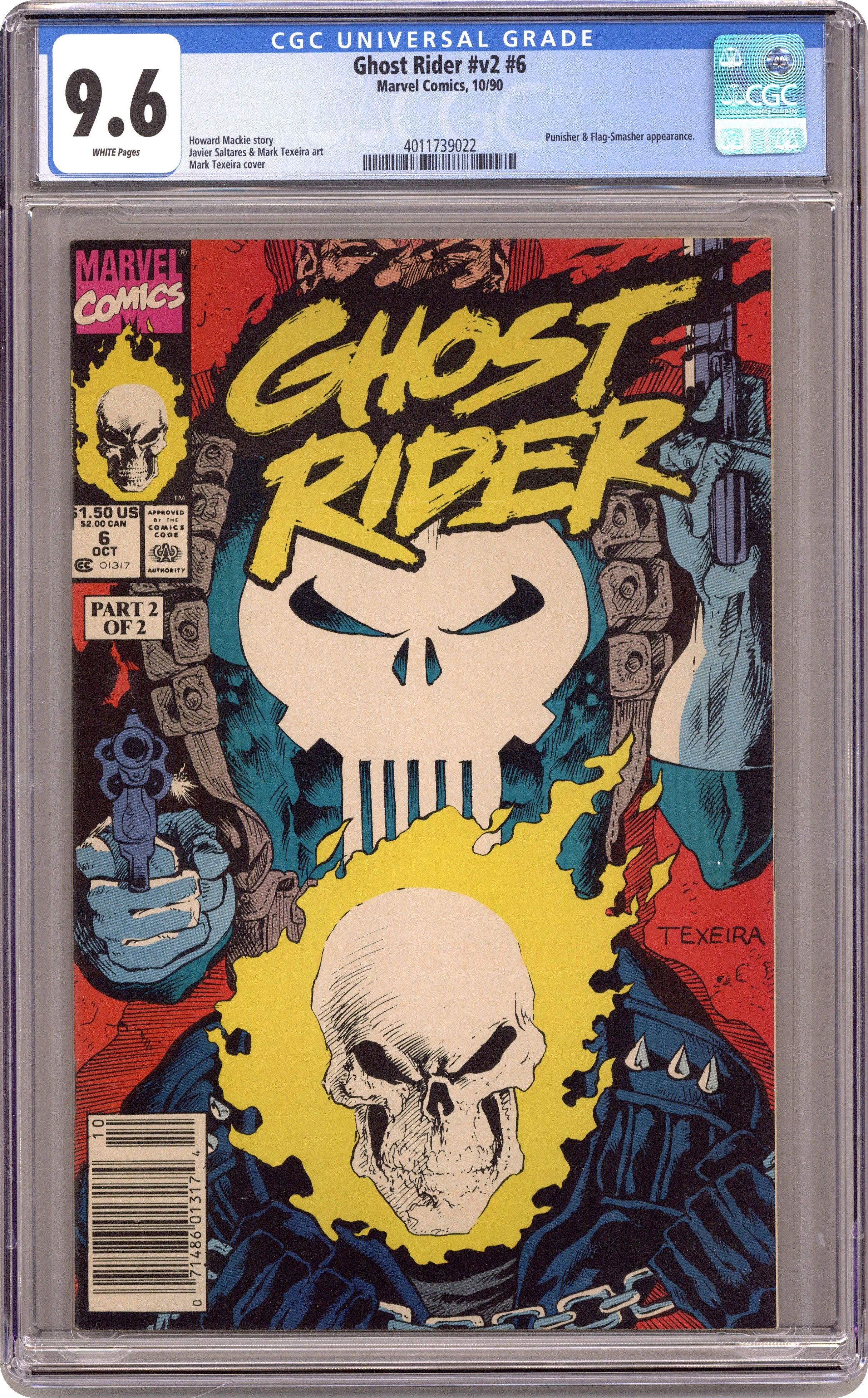 Part 2 of 2 - "Do or Die!" Guest-starring Punisher. Written by Howard Mackie. Art by Javier Saltares and Mark Texeira. Cover by Mark Texeira. Can the Punisher and Ghost Rider stop trying to kill each other long enough to take down Flag Smasher and his gang of thugs? 32 pages, FC. Cover price $1.50. Grade: CGC 9.6 explanation of grade Condition: Used (collectible)