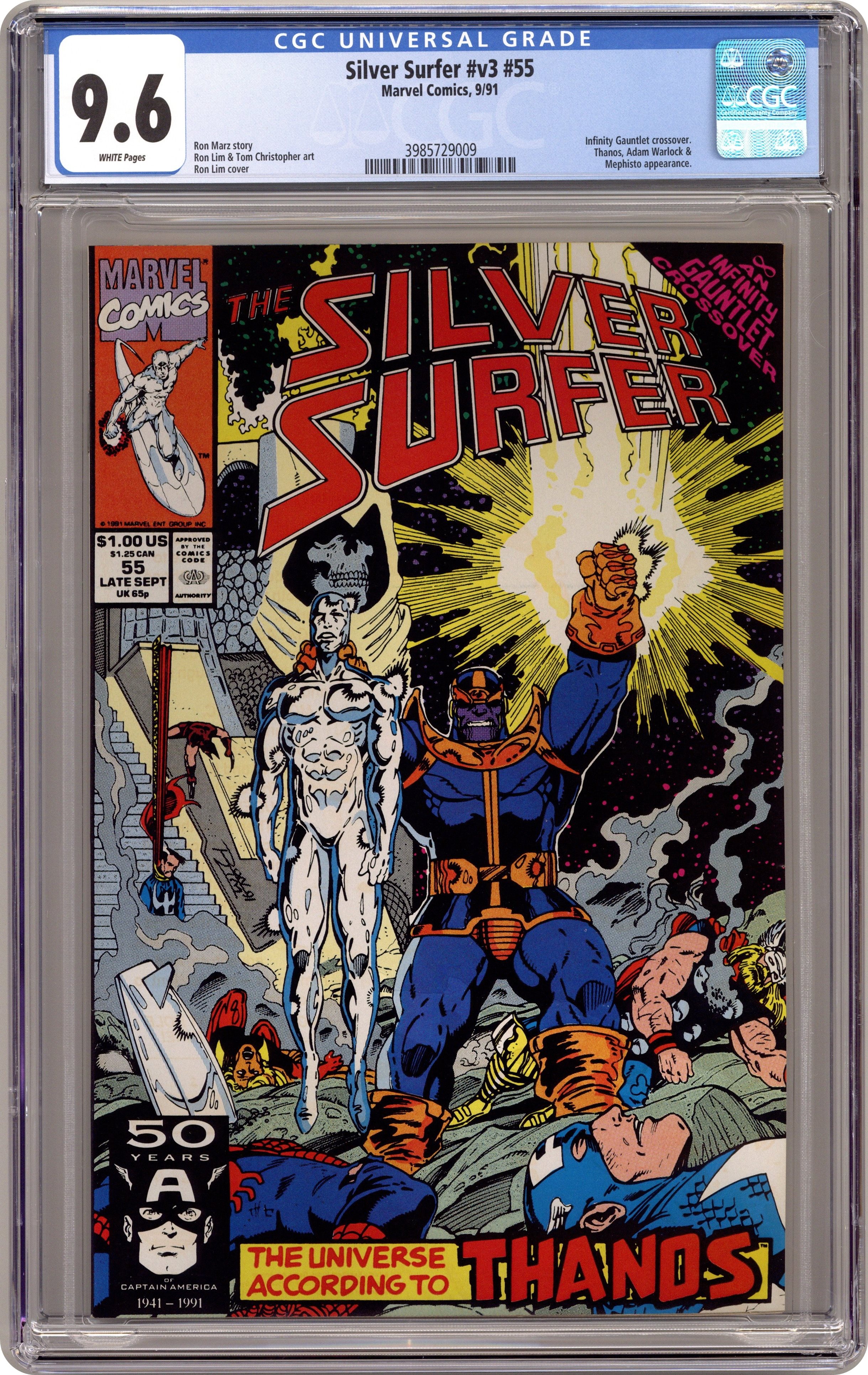 Infinity Gauntlet Crossover. "Genesis!" Part 1. Guest-starring Adam Warlock and the Heroes of Earth. Story by Ron Marz. Art by Ron Lim and Tom Christopher. Story continued from Infinity Gauntlet #3. The worse has come to past. Even with a force including Thor, Hulk, Doctor Strange, and Captain America, the heroes of Earth were no match for Thanos and the power of the Infinity Gauntlet. The Silver Surfer arrives in time to watch Adam Warlock perish and to become a slave as Thanos becomes the ultimate ruler of the universe. 32 pages. Cover price $1.00. Grade: CGC 9.6 explanation of grade Condition: Used (collectible)