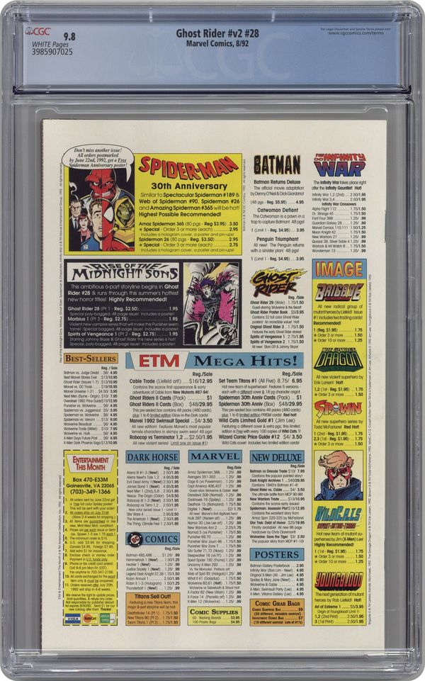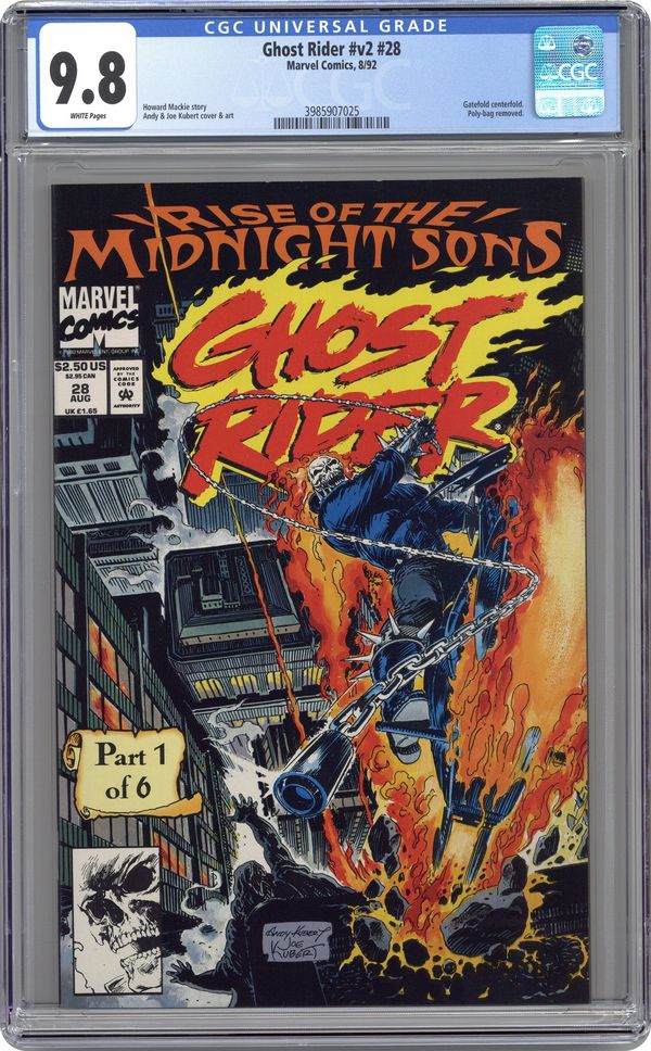 Direct Edition. Rise of the Midnight Sons: Part 1 of 6 - " Visions!" Guest-starring Doctor Strange. Written by Howard Mackie. Art by Andy Kubert and Joe Kubert. Ghost Rider captures two criminals who murdered an elderly woman and deposits them in the mausoleum where he has kept Blackout, Stern, and dozens of other criminals captive. At the Ketch house, Stacy and Gerard Dolan console Francis Ketch over Dan's disappearance. Dolan then gets a call that the police are about to arrest Ghost Rider and leaves to assist. At the cemetery, a man calling himself the Caretaker greets Johnny Blaze and Ghost Rider and tells them the police have surrounded the cemetery. Ghost Rider opens the mausoleum to find all of his captives dead, and, within the void, Dan's spirit experiences a vision given to him by Lilith of an assemblage of supernatural heroes. Blackout and Stern emerge from the crypt and Blackout bites Ghost Rider, causing to experience Lilith's vision as well. Blackout realizes Lilith is his mother and vows to find her. Blackout and Stern flee the mausoleum amidst police gunfire. Michael Badilino, the officer in charge, enters the mausoleum to arrest Ghost Rider, but Caretaker hits him with a shovel and leads Ghost Rider and Blaze through underground tunnels to an unoccupied section of the cemetery. Blackout attempts to flee on a bike Blaze stored in the cemetery, but flees on foot when Blaze sets the bike ablaze hellfire. Blaze, on the flaming bike, and Ghost Rider leave to meet with the Quentin Carnival in Rhode Island, and Caretaker asks the arriving Doctor Strange if he believes he can defeat Lilith. Story continues in Ghost Rider/Blaze: Spirits of Vengeance (1992) #1. 32 pages, FC. Cover price $2.50. Grade: CGC 9.8 explanation of grade Condition: Used (collectible)