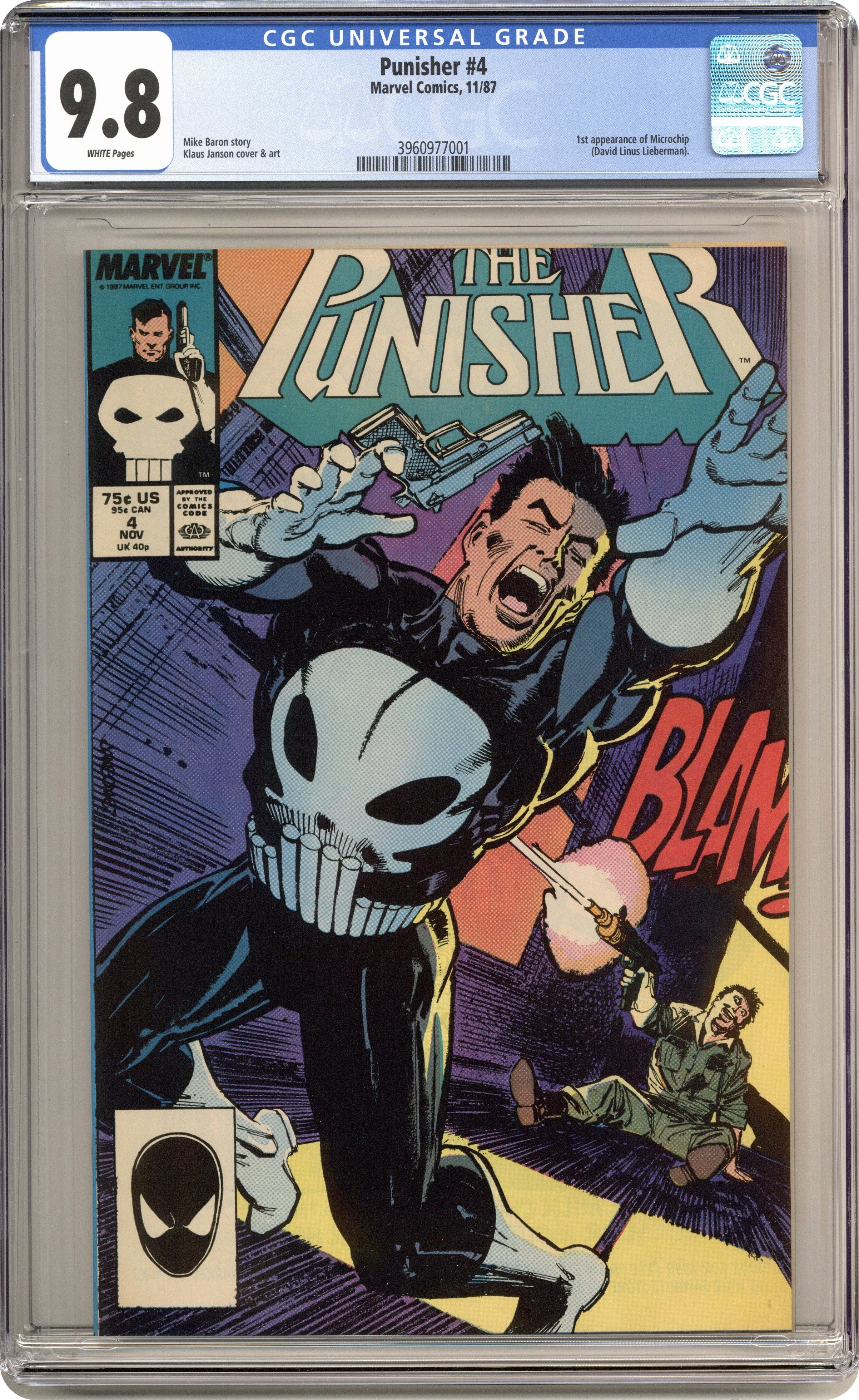 Story by Mike Baron. Art by Klaus Janson. Has the Punisher found God? Frank is shot in the back by a lunatic and lies on his death bed. Luckily a Reverend with a seemingly divine healing touch arrives to save his life. But, there is more to the Rev than meets the eye. Continues in next issue. 32 pages. Cover price $0.75. Grade: CGC 9.8 explanation of grade Condition: Used (collectible)