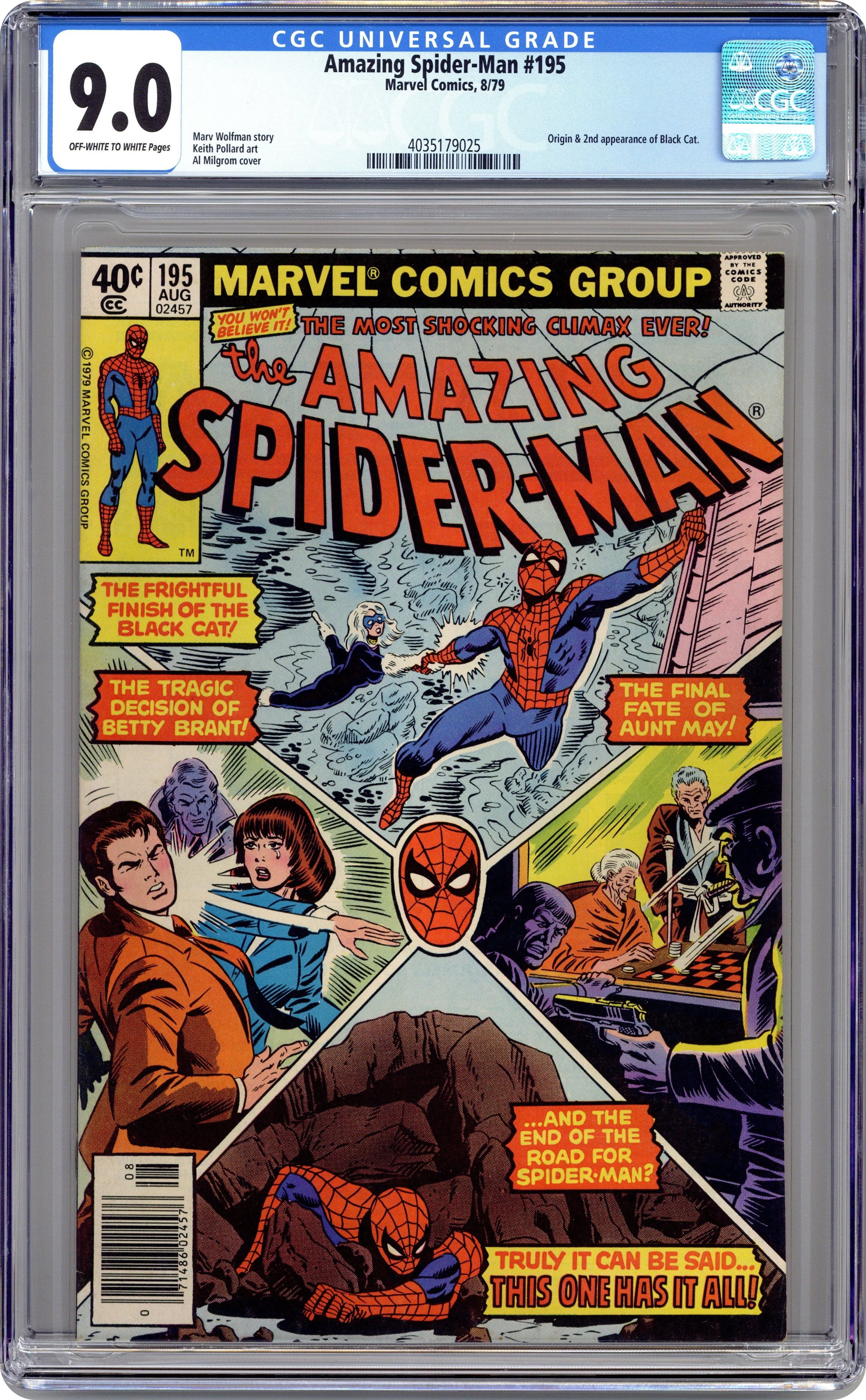 Direct Edition. "Nine Lives of the Black Cat!" Part 2 of 2. Second appearance of the Black Cat. Script by Marv Wolfman. Art by Keith Pollard (breakdowns) and many hands (finishes). Cover by Keith Pollard and Al Milgrom. The Black Cat successfully breaks her father out of prison! And leaves the Spectacular Spider-Man lying in the rubble with a broken arm! What a stroke of bad luck for the web-slinger! However the wondrous wall-crawler is undeterred! And despite his wounded wing, the amazing one tracks down the mischievous cat several hours later! Will Spidey and Felicia end their game of cat & mouse on a friendly note...or a fatal one? Meanwhile, a telegram arrives at Peter Parker's apartment...and with it devastating news for Aunt May's nephew. Brief origin of the Black Cat. Cameo appearances by the Kingpin, Aunt May, Betty Brant, Ned Leeds, Harry Osborn, Flash Thompson, Mysterio (in civilian clothes), and the burglar. (Notes: The Black Cat returns in Amazing Spider-Man 204. The letters page includes a letter from comics historian Peter Sanderson.) 36 pgs. Cover price $0.40. Grade: CGC 9.0 explanation of grade Condition: Used (collectible)