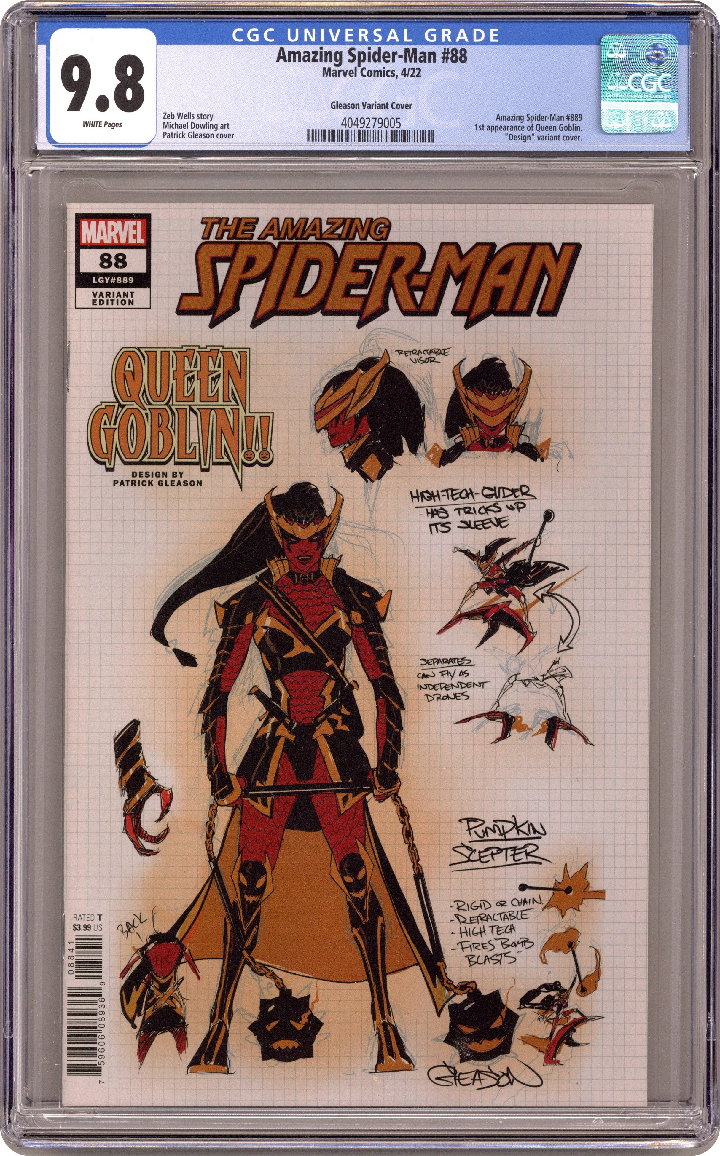 Limited 1 for 10 Retailer Incentive Variant Cover. Written by Zeb Wells. Art by Michael Dowling. Cover by Patrick Gleason. Who is QUEEN GOBLIN?! For almost sixty years, Spider-Man has been defined by Goblins, and Ben Reilly has a brand-new one all his own. 28 pages, full color. Rated T Cover price $3.99. Grade: CGC 9.8 explanation of grade Condition: Used (collectible)