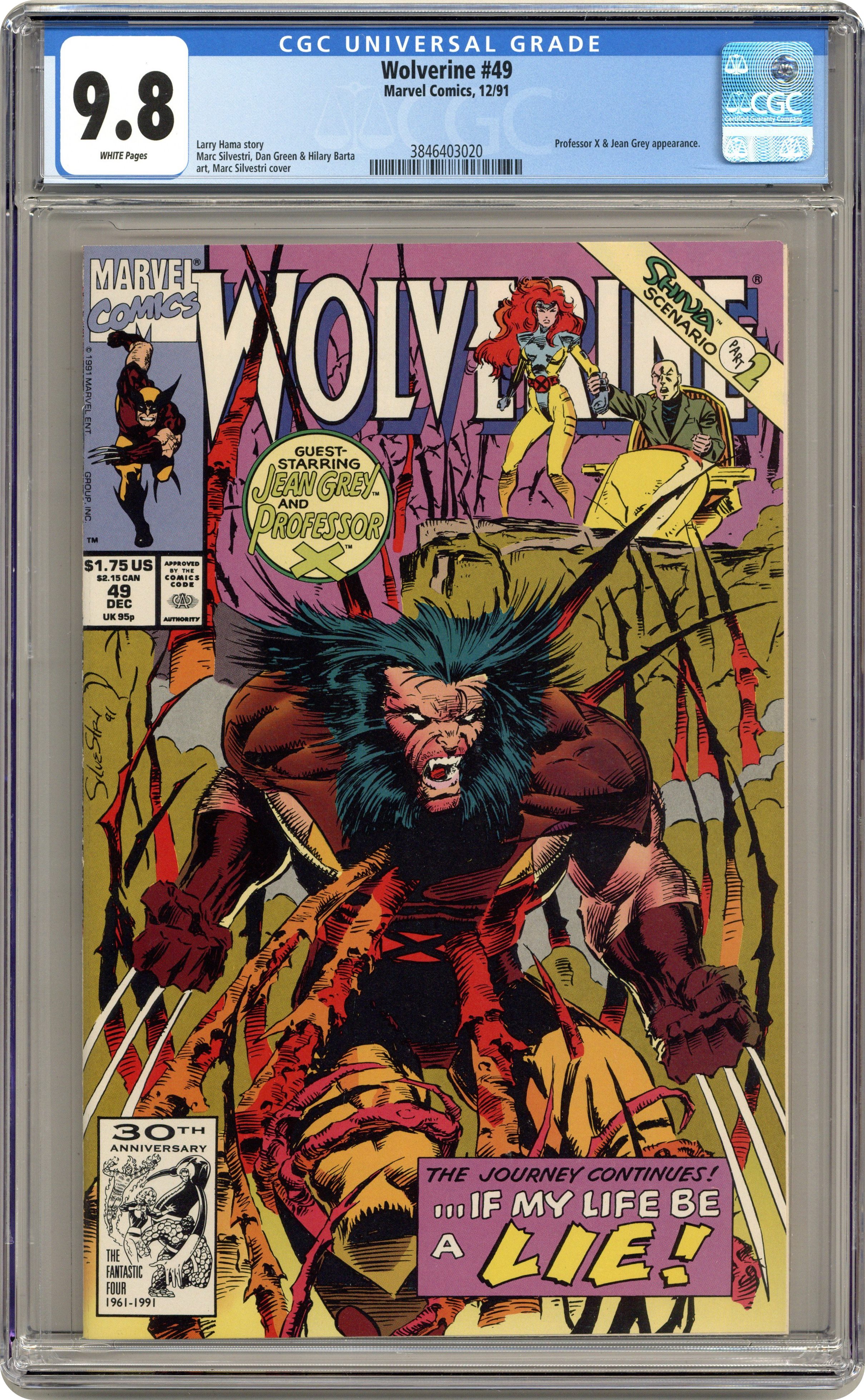 Direct Edition. Shiva Scenario: Phase 2 of 3 - "Dreams of Gore!" Guest-starring Professor X and Phoenix. Written by Larry Hama. Art by Marc Silvestri, Dan Green and Hilary Barta. Cover by Marc Silvestri. Professor Charles Xavier and Jean Grey, the two most powerful telepaths on Earth, reach into Logan's head and search for the answers to what is truth, and is memory implants. NOTE: The astounding sequel to Weapon X from Marvel Comics Presents (1988-1995) #72-84. Cover price $1.75. Grade: CGC 9.8 explanation of grade Condition: Used (collectible)