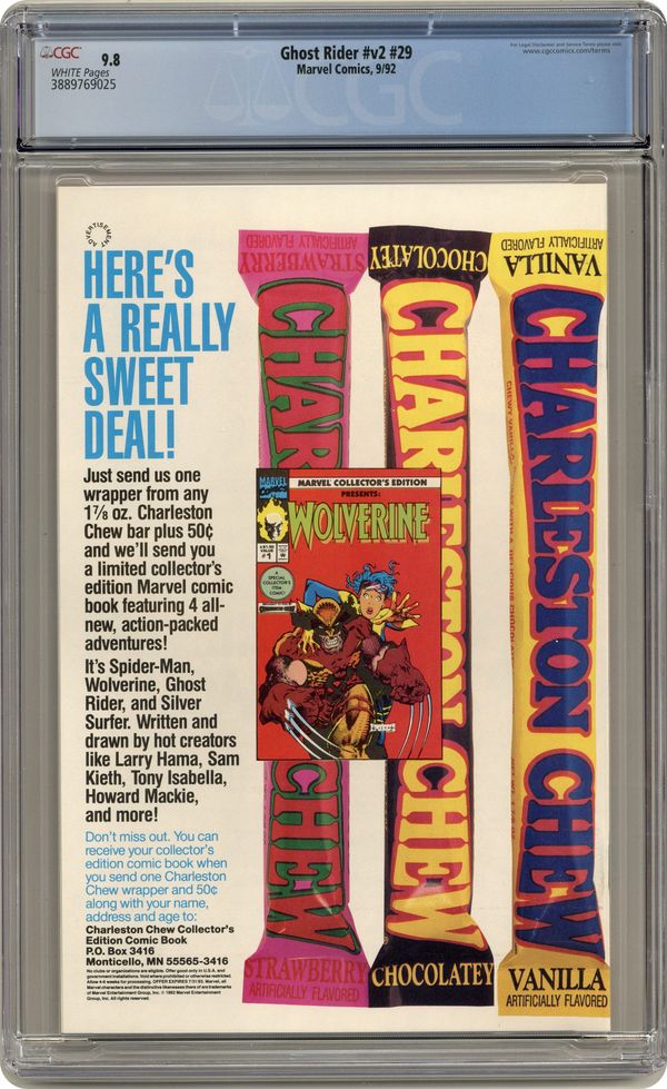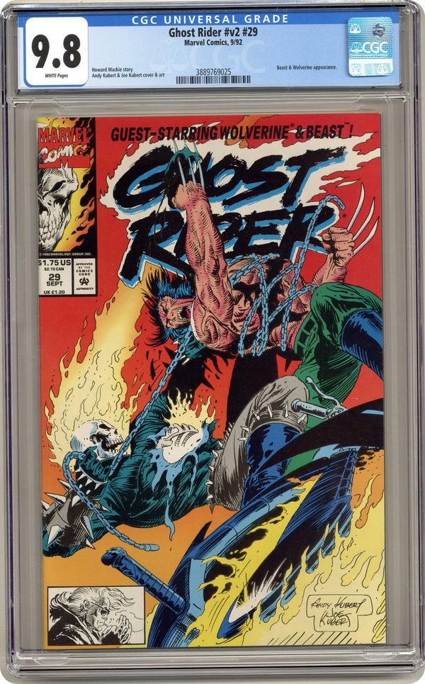 "Biting the Hand that Feeds You!" Guest-starring Wolverine and Beast. Written by Howard Mackie. Art by Andy Kubert and Joe Kubert. A trio of hoodlums attempts to rob Ghost Rider and Johnny Blaze, but is easily subdued. The Beast and Wolverine, the latter following Ghost Rider after noticing his sent was different, give careful chase as Ghost Rider carries the muggers off. Nearby, mercenary Agent-X fails to negotiate a higher profile percentage and level of control with his employer, Frederick Penner. Agent-X returns to his Next Wave cohorts, Snare and Turk, to deliver the news, and the three respond by attacking Penner's mansion headquarters. Ghost Rider drops the muggers off with the police and, as he ponders recent events, Dan Ketch's spirits continues his journey through the void. Ghost Rider spots the mercenaries' attack on the Penner estate and, when Turk kills Penner's neighbor for calling for help, Ghost Rider intervenes, but is ensnared in Snares omnium net. Wolverine and the Beast arrive, free Ghost Rider, and join his battle against the mercenaries. Next Wave initially overwhelm the X-Men and blow Ghost Rider apart, but he regenerates, defeats them, and gives them all the penance stare. Wolverine cautions Ghost Rider that his link to Dan is slipping, and Ghost Rider leaves. Wolverine and the Beast also leave, ignoring Penner's offer of employment. 32 pages, FC. Cover price $1.75. Grade: CGC 9.8 explanation of grade Condition: Used (collectible)