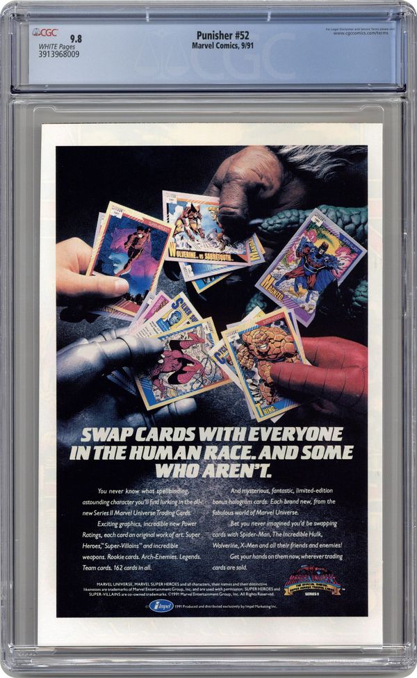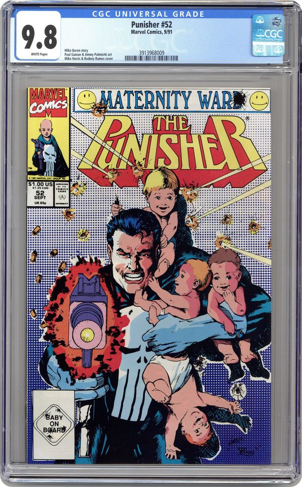 Cover art by Mike Harris and Rodney Ramos. Lupe, script by Mike Baron, pencils by Paul Guinan, inks by Jimmy Palmiotti; Punisher battles a woman who kills moms and sells their kids. 36 pgs. $1.00. Cover price $1.50. Grade: CGC 9.8 explanation of grade Condition: Used (collectible)