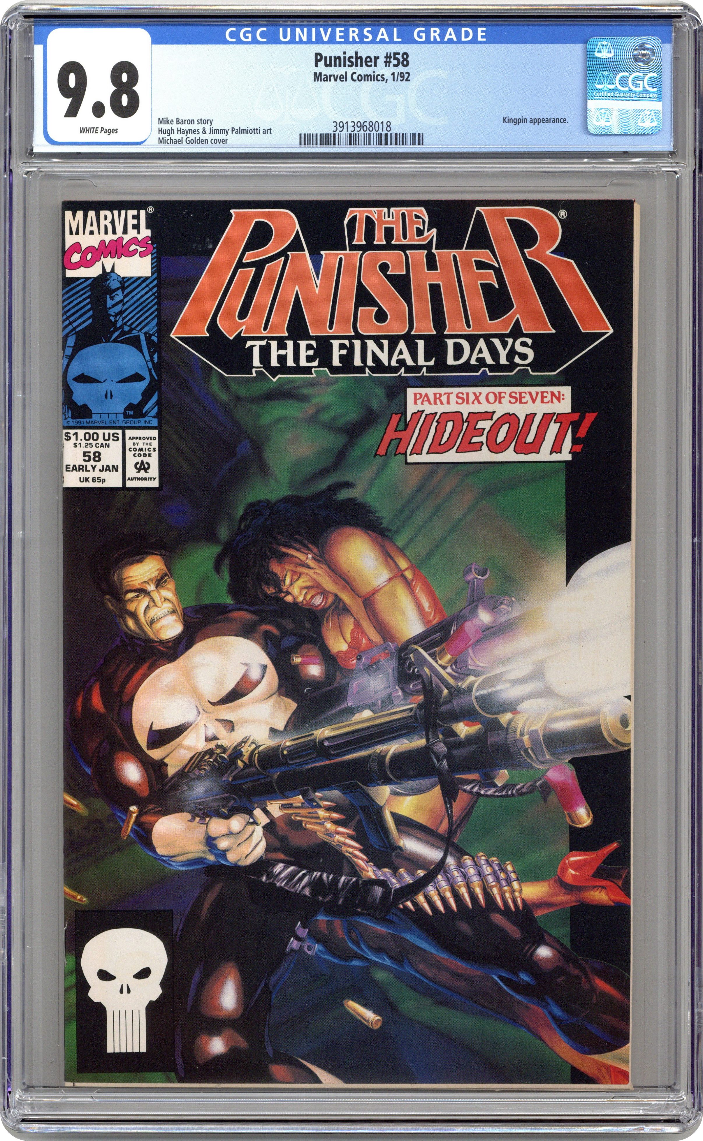 Cover art by Michael Golden. The Noose Tightens, script by Mike Baron, pencils by Hugh Haynes, inks by Jimmy Palmiotti; with the Kingpin in pursuit, Punisher tries to recover from the damage done to his face. Punisher illo by Mickey Ritter. Punisher illo by Mickey Ritter, inks by Bob McLeod. 36 pgs. $1.00. Cover price $1.00. Grade: CGC 9.8 explanation of grade Condition: Used (collectible)