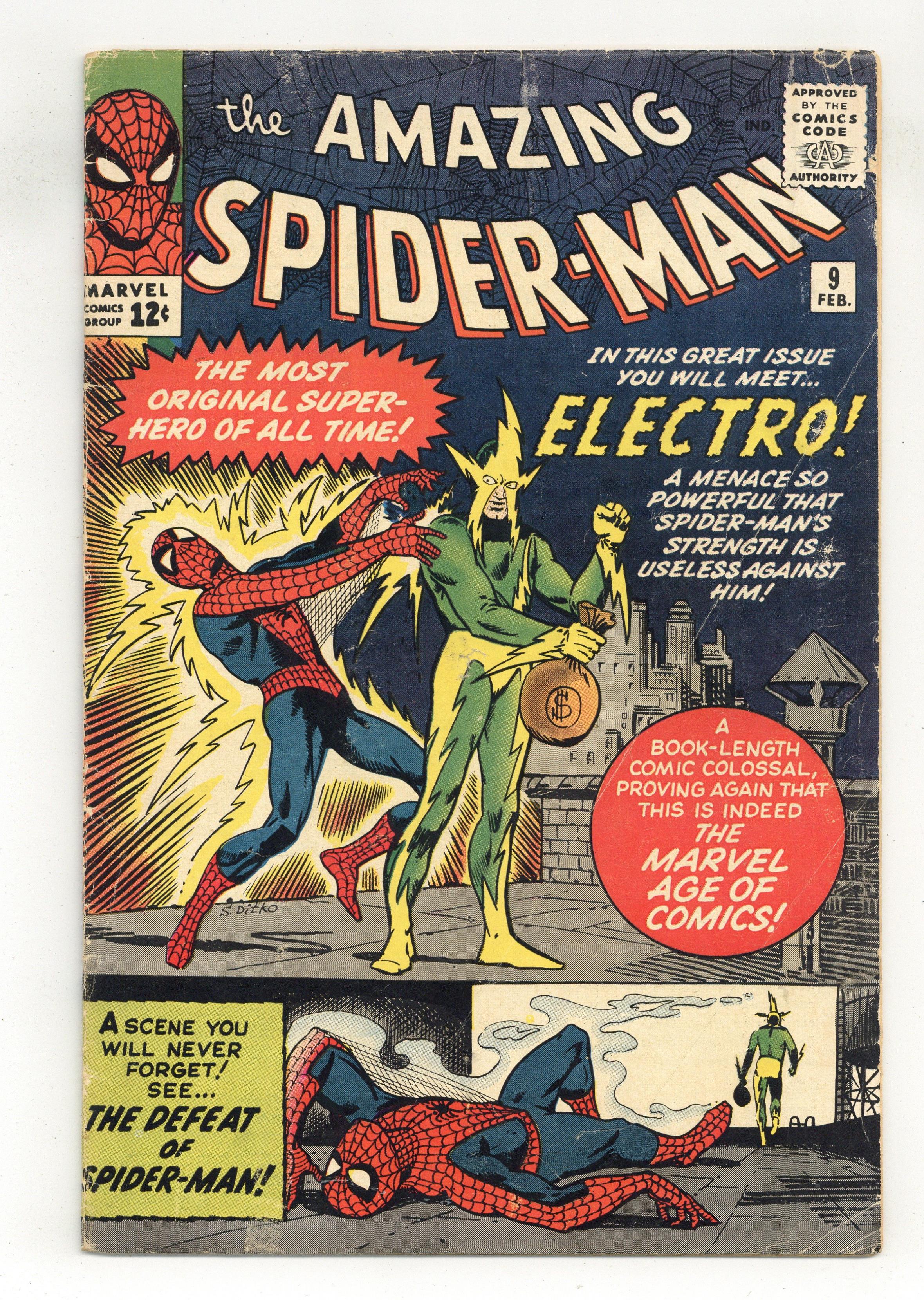 Cover art by Steve Ditko. First appearance of Electro in The Man Called Electro!, script by Stan Lee, art by Steve Ditko; Electro decides to break some other criminals out of jail so they can help him with his crime spree; Spider-Man must balance taking care of Aunt May, who is in the hospital, and capturing Electro. Reprinted in Marvel Tales # 6 and 146. 36 pgs. $0.12. Cover price $0.12. Grade: GD 2.0 explanation of grade Condition: Used (collectible)
