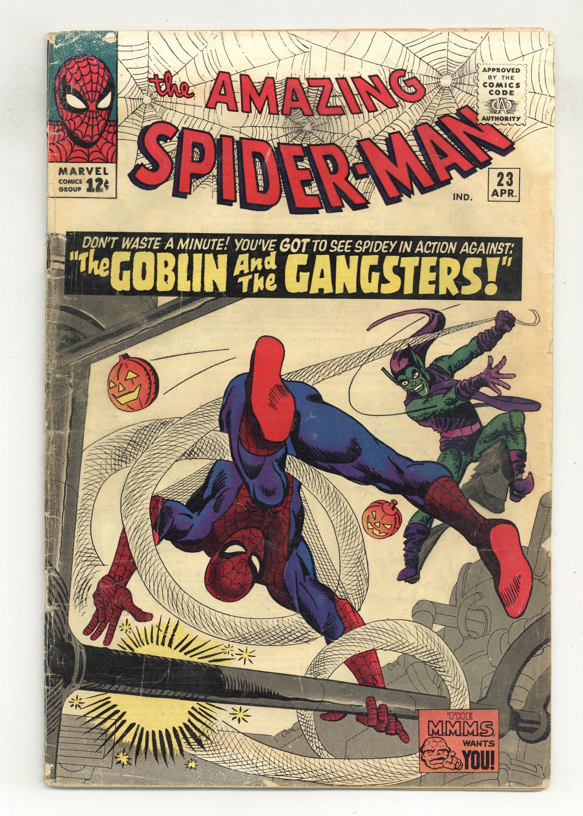 Cover art by Steve Ditko. The Goblin and the Gangsters, script by Stan Lee, art by Steve Ditko; the Green Goblin returns and wants to take over Lucky Lobos mob; Spidey battles Lucky Lobo and his gang; Spidey fights the Green Goblin in a factory. Reprinted in Marvel Tales # 18 and 161. Letter from Jim Shooter, former editor-in-chief at Marvel, critiquing Marvel's handling of Spider-Man. 36 pgs. $0.12. Cover price $0.12. Grade: FR/GD 1.5 explanation of grade Condition: Used (collectible)