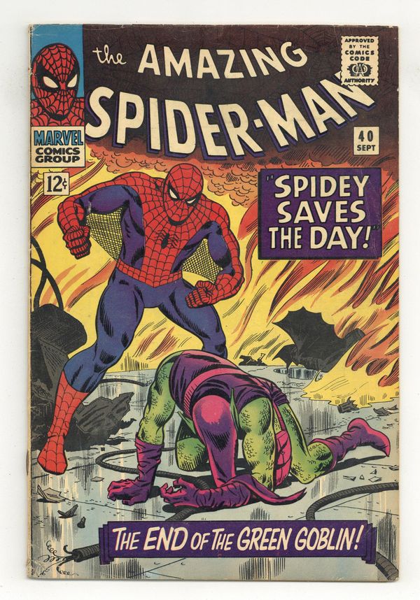 Cover by pencils by John Romita Sr., inks by Mike Esposito and John Romita Sr. (touch-ups). Green Goblin origin in Spidey Saves the Day!. script by Stan Lee, pencils by John Romita Sr., inks by Mike Esposito (as Mickey Demeo) and John Romita Sr. (touch-ups); Spider-Man battles the Green Goblin; While battling, an explosion erases the last several years of Norman Osborn's memory, reverting him to his pre-Green Goblin state. Reprinted in Marvel Tales # 179. 36 pgs., full color. $0.12. Cover price $0.12. Grade: VG- 3.5 explanation of grade Condition: Used (collectible)