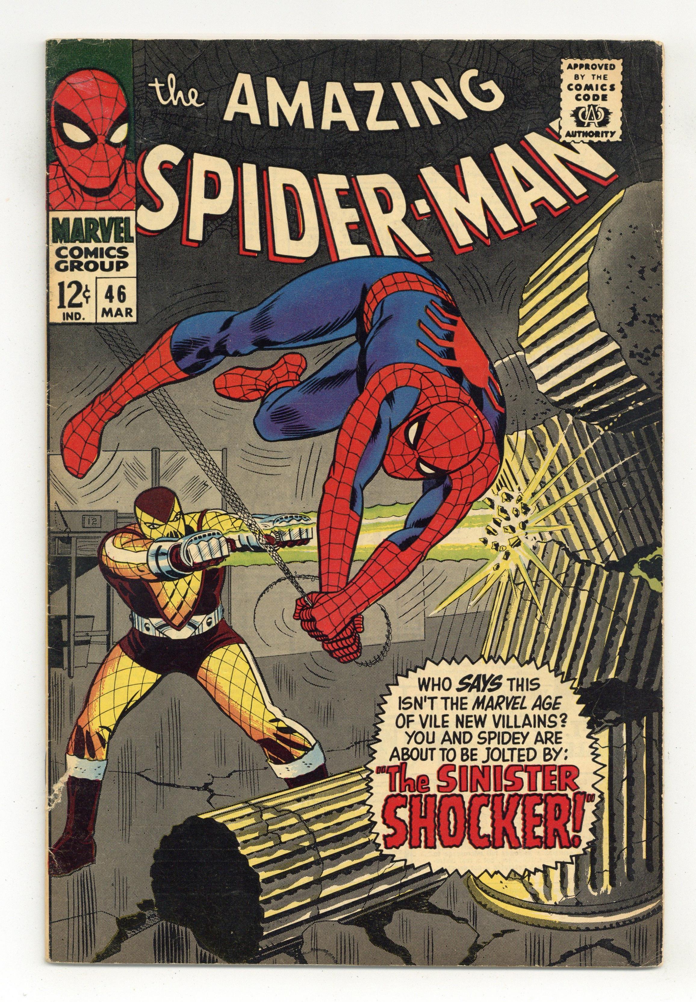 Cover by John Romita Sr.. First appearance of the Shocker in "The Sinister Shocker," script by Stan Lee, art by John Romita Sr.; Peter moves in with Harry and is confronted by the Shocker for the first time; Shocker brutalizes Spider-Man, but the Webslinger defeats him with his webs; once at Harrys, Peter doesn't feel happy, although he doesn't know why. Reprinted in Marvel Tales # 186. 36 pgs., full color. $0.12. Cover price $0.12. Grade: VG 4.0 explanation of grade Condition: Used (collectible)