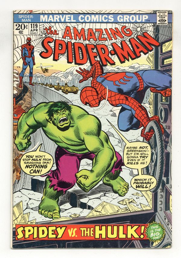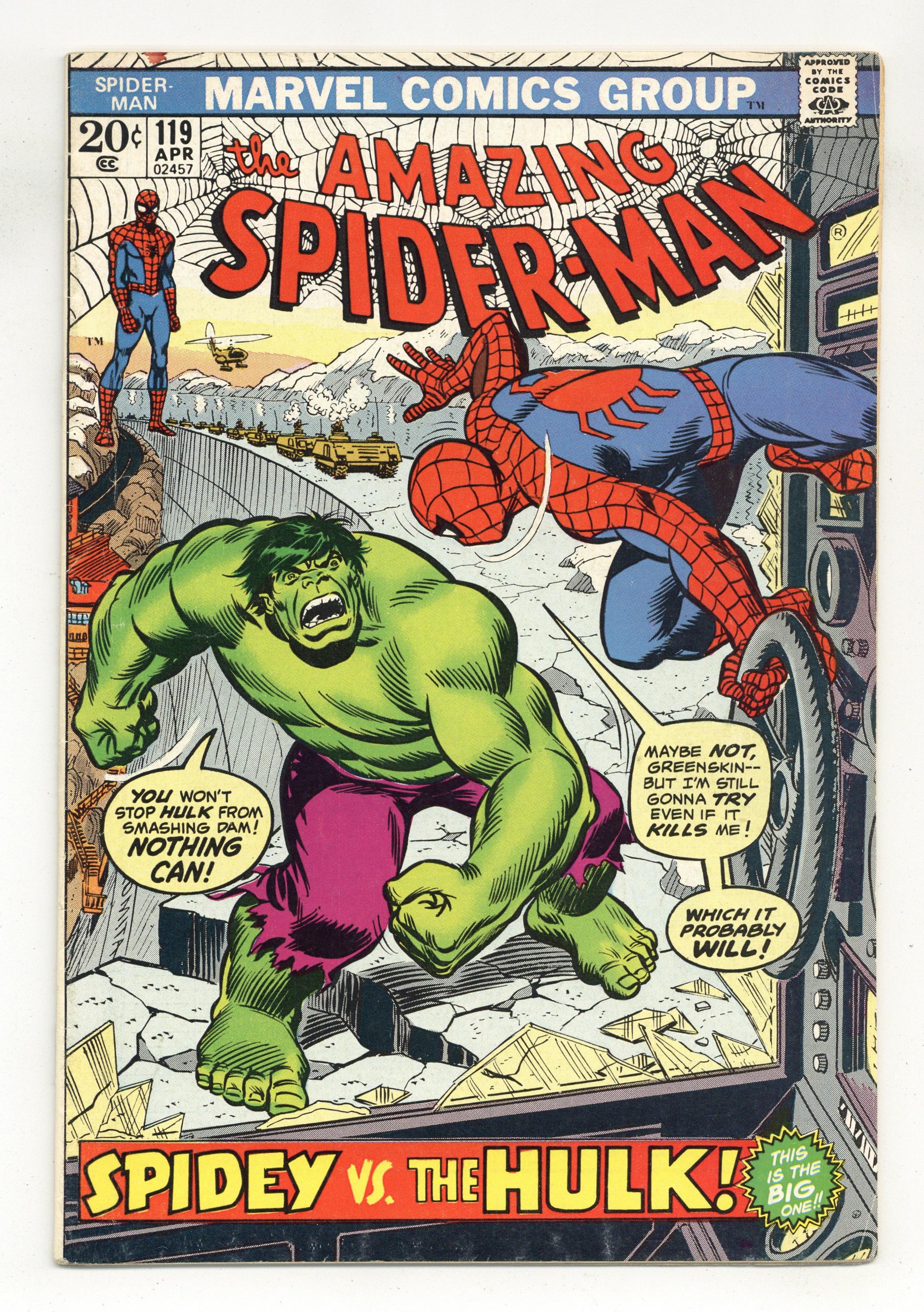 "The Gentleman's Name is...Hulk!" Part 1 of 2. Guest-starring the Hulk. Script by Gerry Conway. Pencils by John Romita. Inks by John Romita and Tony Mortellaro (backgrounds). Cover by John Romita. The Amazing Spider-Man vs. the Incredible Hulk! Wow! But how did the two combatants meet in Canada of all places? A few days ago, a mysterious telegram arrived from Montreal for May Parker. At first Peter was going to show it to his aunt, however he changed his mind upon realizing the telegram could beconnected to Dr. Octopus! The web-slinger wants to go to Quebec to investigate, but he needs money for airfare. Luckily, Peter convinces J. Jonah Jameson to send him north of the border to photograph the Hulk (in a peaceful manner). But thanks to Thunderbolt Ross and the Canadian military, the Hulk is already on a rampage! And your friendly neighborhood Spider-Man has to stop him! Cameo appearances by Aunt May, Harry Osborn, Norman Osborn, Betty Brant, and Ned Leeds. (Notes: John Romita is credited as a co-plotter. Spider-Man and the Hulk previously battled in Amazing Spider-Man Annual #3.) 36 pages. Cover price $0.20. Grade: VG+ 4.5 explanation of grade Condition: Used (collectible)