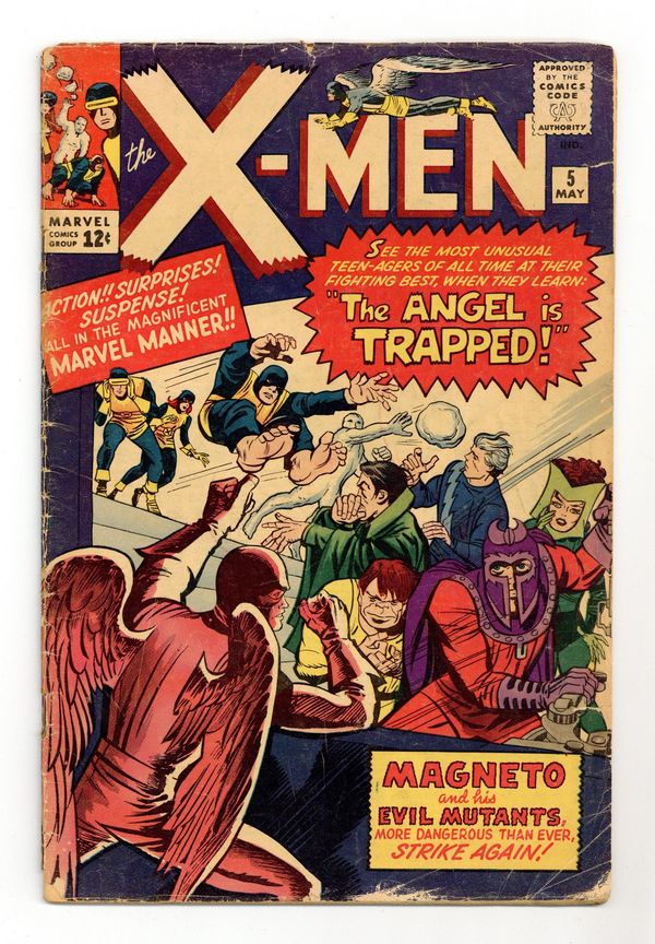Cover pencils by Jack Kirby, inks by Paul Reinman and Marie Severin (Angel alterations). Trapped: One X-Man!, script by Stan Lee, pencils by Jack Kirby, inks by Paul Reinman; With Xavier's mental powers gone, the X-Men try to decide how they will function without his leadership; Trying to ferret out the X-Men, Magneto has the Toad enter an atheletic event where he leaps to victory; With the crowd turning hostile due to the Toads amazing abilities, the X-Men arrive on the scene to capture him; Magneto snags Angel and whisks him away to Asteroid M; In an attempt to trade the Toad for Angel, the X-Men arrive on Asteroid M where they battle the Brotherhood once again; On their safe return to earth, Xavier revels that his power loss was a ruse to test his students. First Appearance of Magneto's Asteroid M; Prof's loss of powers just a test. Letter column begins in this issue. 36 pgs. $0.12. Cover price $0.12. Grade: GD 2.0 explanation of grade Condition: Used (collectible)