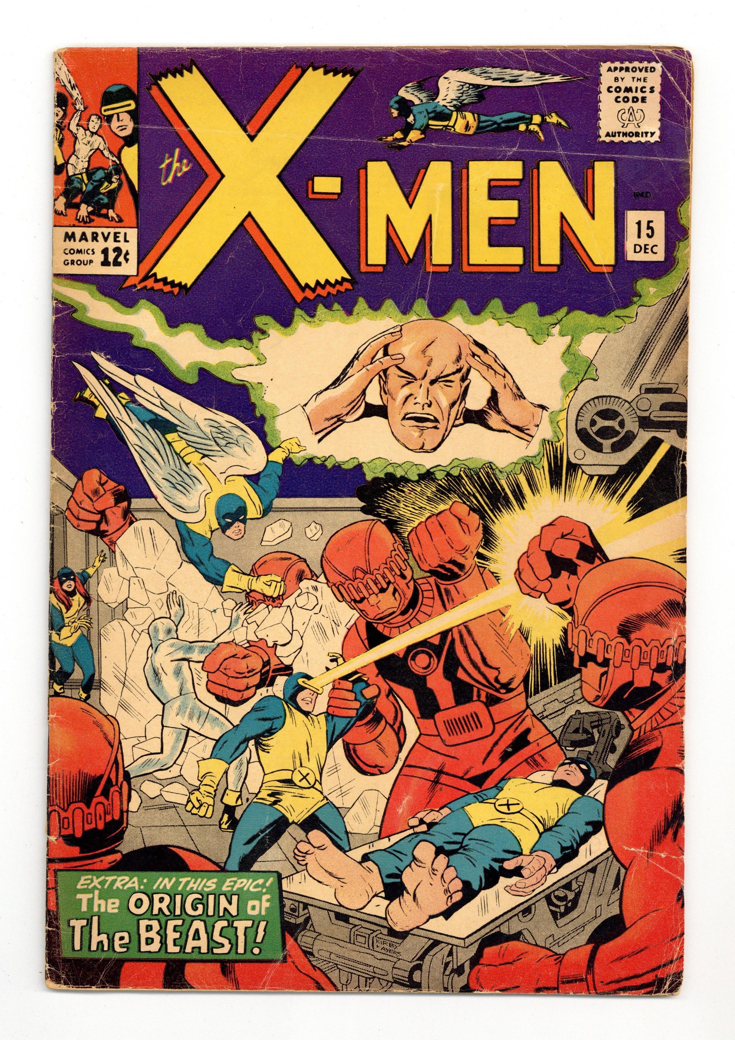 The origin of the Beast. Cover pencils by Jack Kirby, inks by Dick Ayers. Prisoners of the Mysterious Master Mold!, script by Stan Lee, pencils by Jack Kirby (layouts) and Werner Roth [as Jay Gavin] (pencils), inks by Dick Ayers; The X-Men invade the Sentinel's underground complex but are captured; Beast is taken before the Sentinel's leader, Master Mold, and has his mind probed; Master Mold commands Trask to make an army of Sentinels so they can take over the world. 36 pgs. $0.12. Cover price $0.12. Grade: GD 2.0 explanation of grade Condition: Used (collectible)
