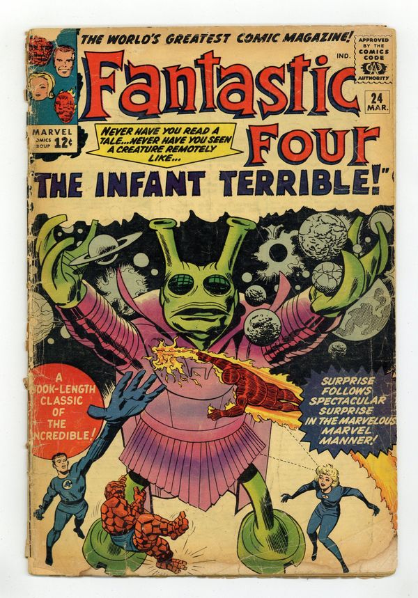 Cover pencils by Jack Kirby, inks by George Roussos. The Infant Terrible!, script by Stan Lee, pencils by Jack Kirby, inks by George Roussos [as Geo. Bell]; An extra-terrestrial wreaks havoc in New York City, until Reed deduces that it is an infant and summons its parents. Letter to the editor from writer Don Glut. 36 pgs. $0.12. Cover price $0.12. Grade: GD- 1.8 explanation of grade Condition: Used (collectible)