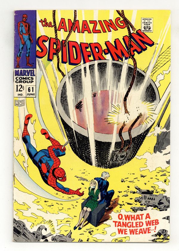"What a Tangled Web We Weave!" Part 3 of 3. Script by Stan Lee. Art by John Romita (layouts) and Don Heck (pencils). Inks by Mike Esposito (as Mickey Demeo). Cover by John Romita. Gwen Stacy realizes that her father is seriously ill -- plus in danger -- so she takes him to the airport to leave New York City. But the Kingpin's men intercept them in the terminal...and take the pair to their boss' new hideaway -- inside Norman Osborn's chemical plant! After hours of searching, the web-slinger learns where Gwen andCaptain Stacy are being held. And he dashes to their location...for a very personal showdown vs. the Kingpin of Crime! Can the amazing one knock out the Kingpin and save Gwen? Perhaps Norman Osborn (of all people) will lenda hand! Cameo appearances by Mary Jane Watson, Harry Osborn, and J. Jonah Jameson. (Notes: This issue is Gwen Stacy's first cover appearance. This story was reprinted in Marvel Tales #44.) 36 pages. Cover price $0.12. Grade: FN- 5.5 explanation of grade Condition: Used (collectible)