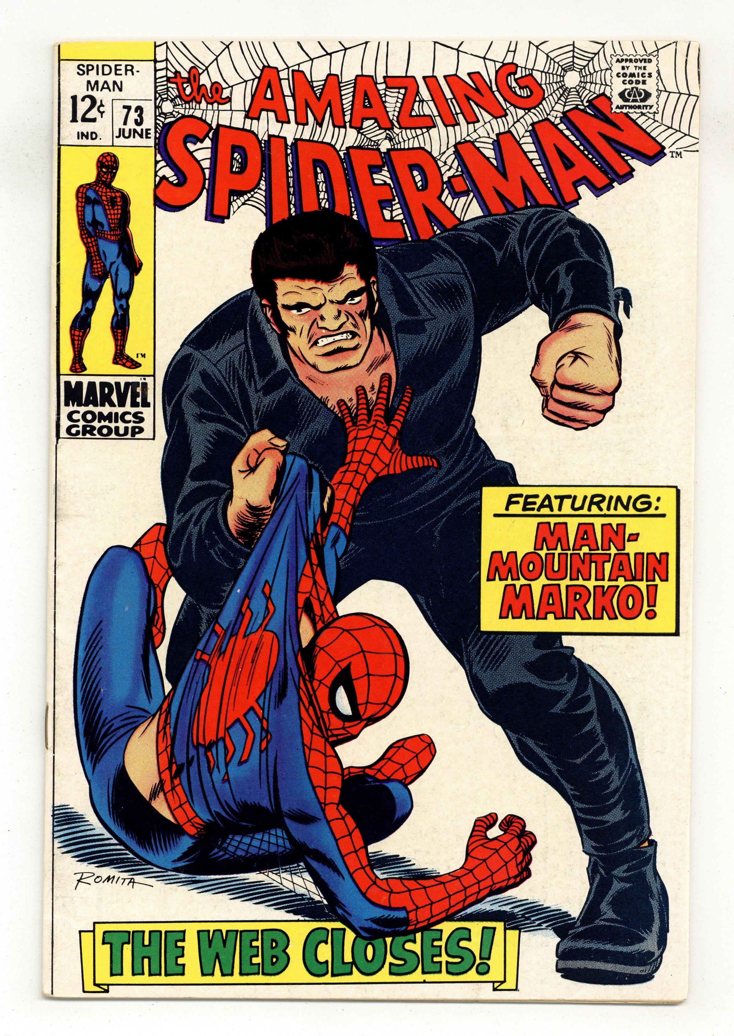 First appearances of Silvermane and Man-Mountain Marko in "The Web Closes!" Plot by John Buscema and John Romita. Script by Stan Lee. Art by John Buscema (layouts) and Jim Mooney (finishes). Cover by John Romita. Spider-Man is in hot pursuit of the ancient clay tablet! And he receives atip from Captain Stacy -- that the Shocker's girlfriend may have it. The wall-crawler rushes to her apartment, but a new super-villain is already there: Man-Mountain Marko! The Maggia sent Marko to get the petrified tablet...and nobody is going to stop him! The web-slinger tries his best,but the raging bull grabs the tablet and takes it to his boss: Silvermane. Why does Silvermane want the tablet? And why does he need Dr. Curt Connors' help? Cameo appearances by Gwen Stacy, Caesar Cicero, Joe Robertson, Randy Robertson, and J. Jonah Jameson. (Notes: The letters page includes letters from comics historian Peter Sanderson and comics writer J.M. DeMatteis, respectively. This story was reprinted in Marvel Tales #54.) 36 pages. Cover price $0.12. Grade: FN- 5.5 explanation of grade Condition: Used (collectible)