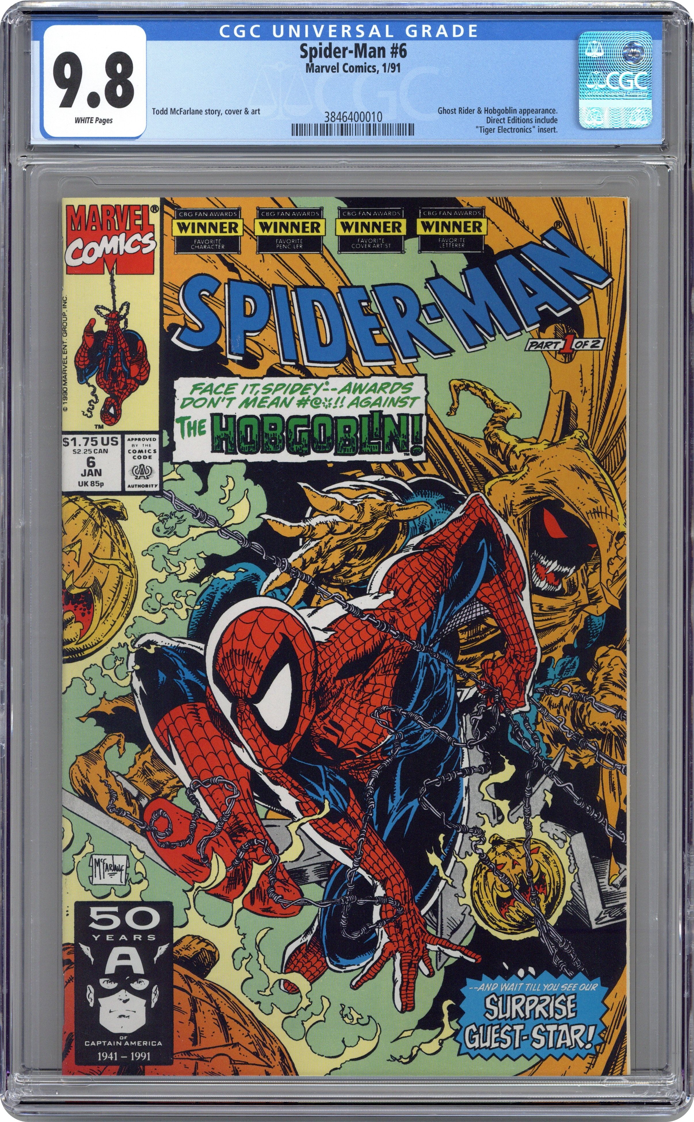 Direct Edition. Masques Part 1 of 2. Guest-starring Ghost Rider. Script and art by Todd McFarlane. Cover by Todd McFarlane. The Hobgoblin (aka the Demogoblin) has sunk further into madness -- and begun kidnapping people and killing them...including children. Law enforcement personnel and the web-slingerare both appalled. And Spider-Man vows to stop the sick super-villain. But someone else in NYC also vows to make the Hobgoblin pay for his crimes: the Spirit of Vengeance! The Hobgoblin better hope the wall-crawler locates himfirst -- and not the Ghost Rider! Cameo appearance by Mary Jane Watson. 36 pages. Cover price $1.75. Grade: CGC 9.8 explanation of grade Condition: Used (collectible)