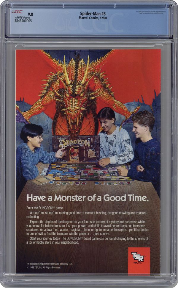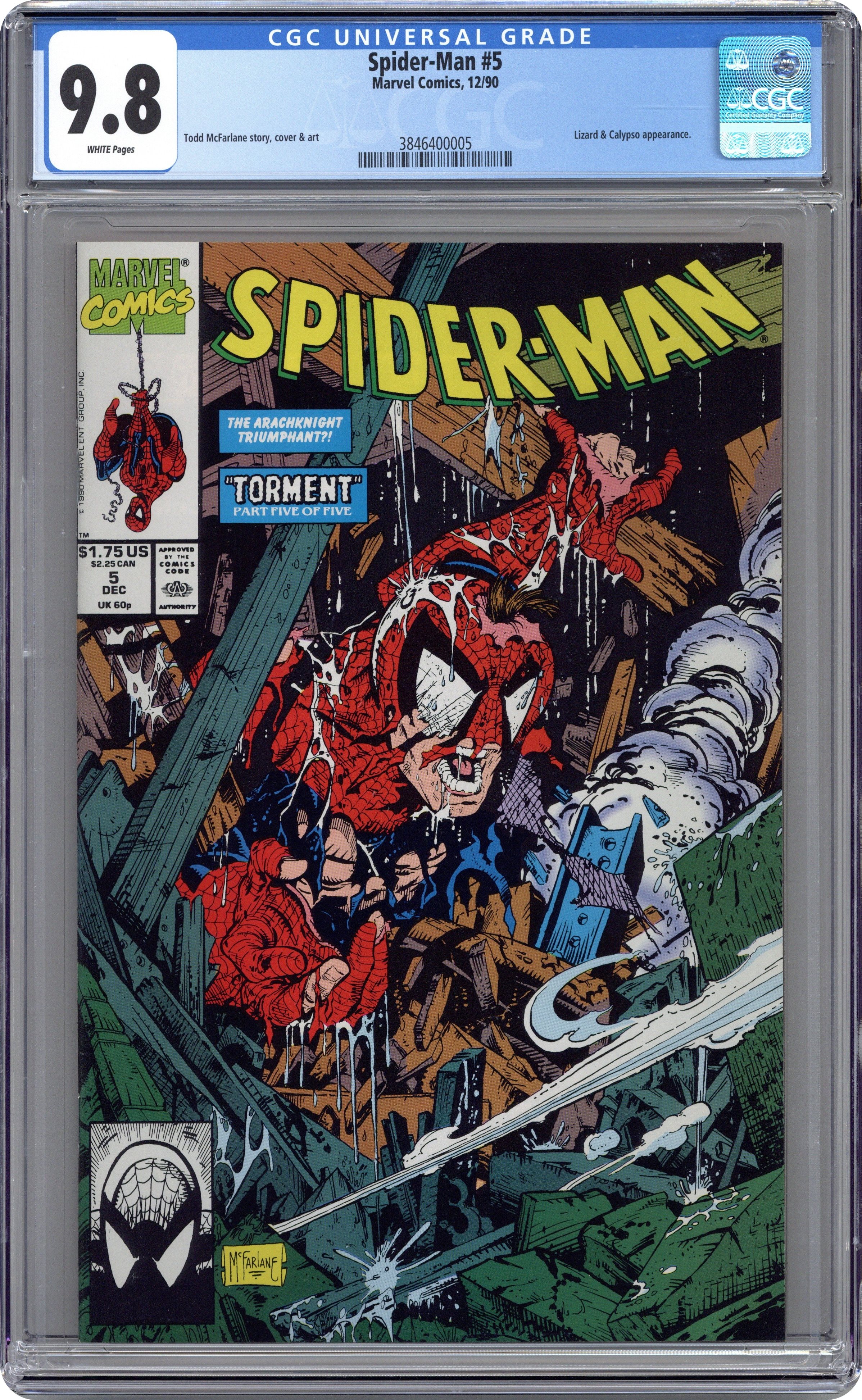 Direct Edition. Direct Edition. Torment Part 5 of 5. "Torment" Script and art by Todd McFarlane. Cover by Todd McFarlane. At the end of last issue, the former mansion of Kraven the Hunter exploded -- with the wall-crawler, the Lizard, and Calypso inside! Miraculously, Spider-Man survived, but so did the Lizard! And It's going to take all the inner strength and courage the web-slinger can muster -- to put the Lethal Lizard down for the count! Can your friendly neighborhood Spider-Man do it? A frantic finish! Appearance by Mary Jane Watson. (Note: The Lizard returns in Amazing Spider-Man 365.) 32 pages. Cover price $1.75. Grade: CGC 9.8 explanation of grade Condition: Used (collectible)