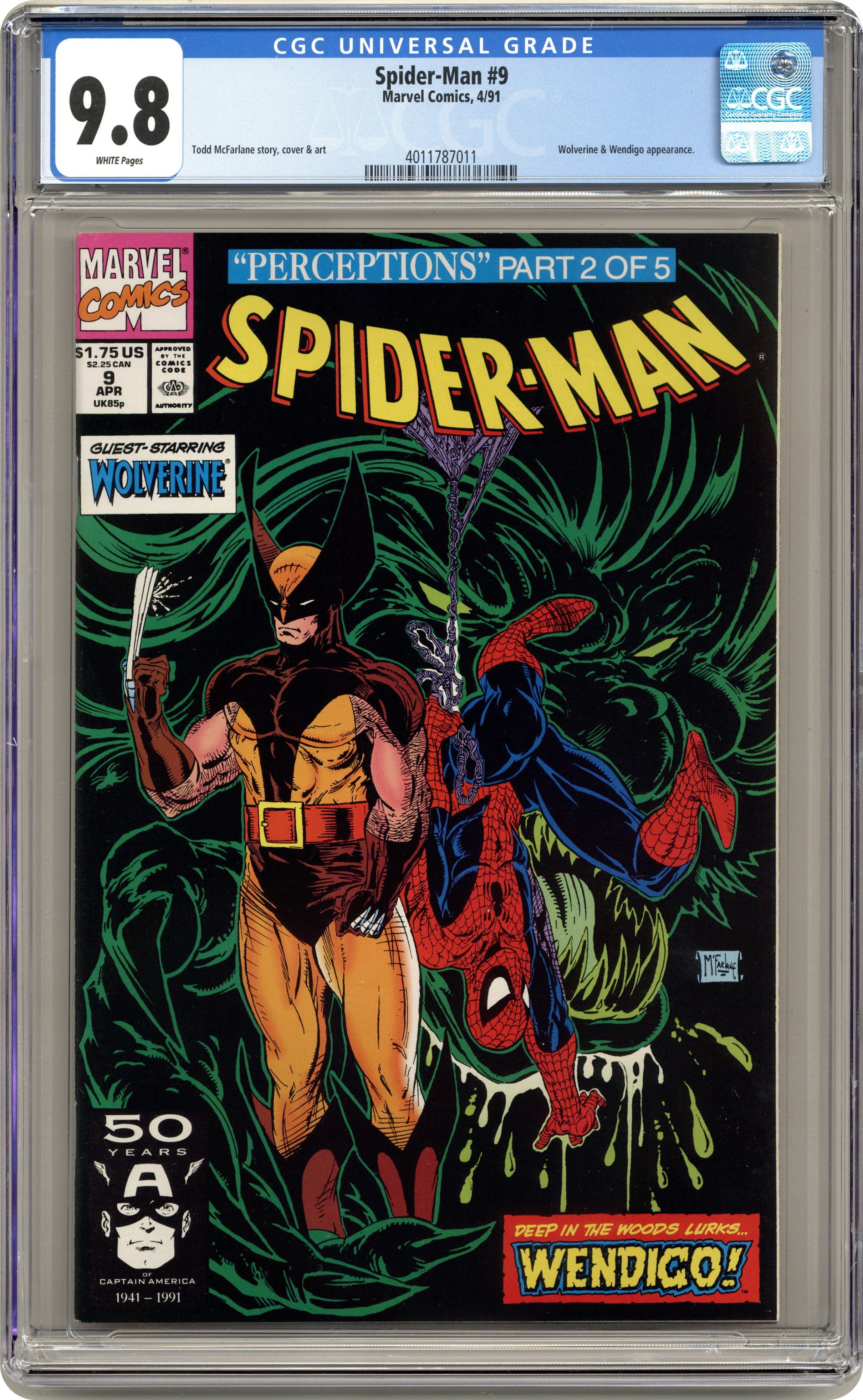 Direct Edition. Perceptions Part 2 of 5. Guest-starring Wolverine. Script and art by Todd McFarlane. Cover by Todd McFarlane. The feral mutant with adamantium claws joins the search in British Columbia for the unknown child killer. And withhis enhanced tracking senses, Wolverine has a good chance of locating the murderer before the Canadian authorities do. In the meantime, Peter Parker hits the streets to learn information about the homicides. And after talking with an old man...he hears the word "Wendigo" for the first time (inregard to the murders). Oh no, has an ancient evil returned to stalk the Canadian wilderness? (Note: This five-part story was reprinted in 2012 in the hardcover: Spider-Man Perceptions.) 32 pages. Cover price $1.75. Grade: CGC 9.8 explanation of grade Condition: Used (collectible)