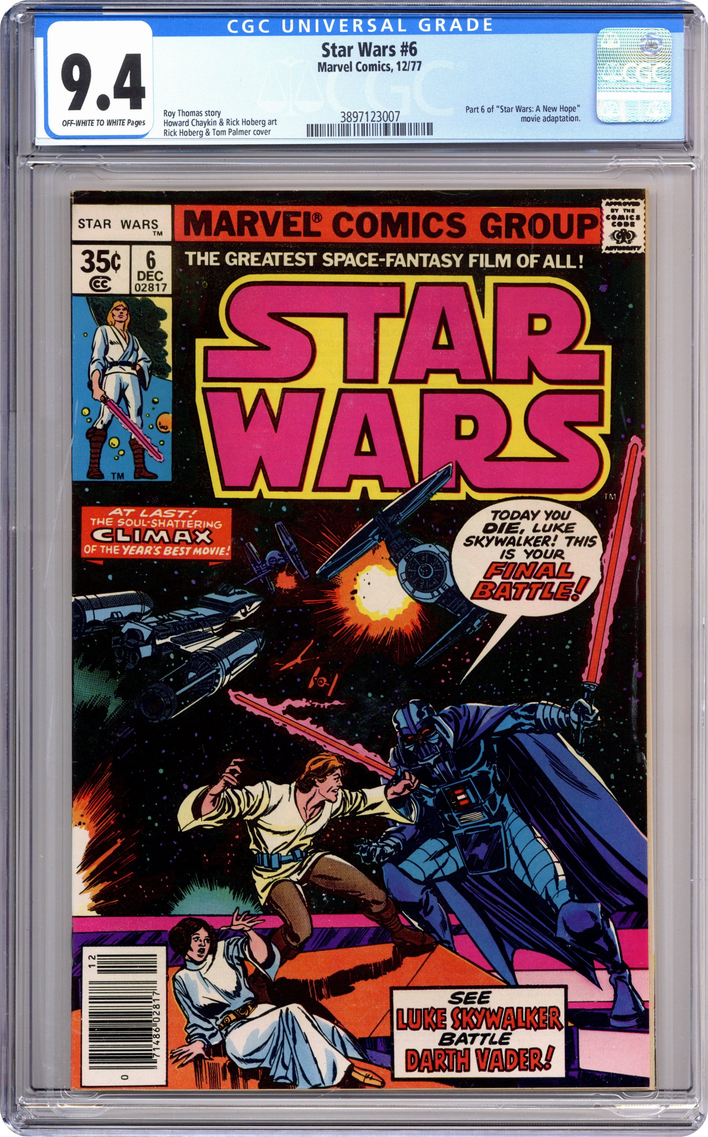 1st printing, standard 35 Cent Newsstand Edition with UPC. A New Hope: Part 6 of 6. "Is this the Final Chapter?!" Based on the screenplay by George Lucas. Adapted by Roy Thomas. Art by Howard Chaykin, Rick Hoberg, and Bill Wray. This is it, the explosive conclusion to the biggest space epic of all time! Armed with the secret plans, the Rebel Alliance mounts an all out attack on the evil Empire's ultimate weapon, the Death Star. However, they'll have to break through the monstrous space station's own defenses and dozens of deadly Tie-Fighters to get to its weak point. As the Rebels' time begins to run out, and their fleet of X-Wing Fighters begins to dwindle, it falls upon young Luke Skywalker and the power of the force to save the day. But first he'll have to get past the most dangerous man in the galaxy - Darth Vader! Cover price $0.35. Grade: CGC 9.4 explanation of grade Condition: Used (collectible)