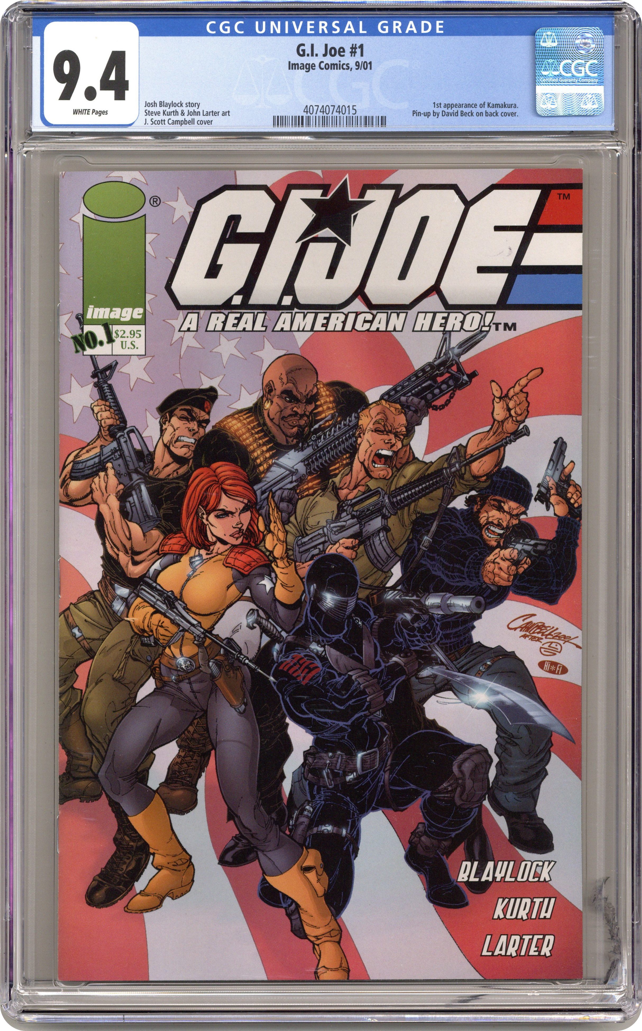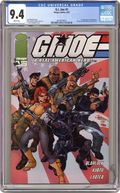 FIRST PRINT! (W) Joshua Blaylock (P)Steven Kurth (I)John Larter (Cover) J. Scott Campbell. Reinstated! Part 1 of 4. The world's greatest task force returns! When secret government technology disappears into thin air, the clues lead to the unbelievable - Cobra, the ruthless terrorist faction of the 1980's, hell-bent on world domination ? is back! Only a highly elite squadron of "Real American Heroes" can stop them: G.I.JOE! Old favorites return to usher in a new era of G.I.Joe, and to shut Cobra down before they can slither their way back into American life. With painted back cover by David Michael Beck. Cover price $2.95. Grade: CGC 9.4 explanation of grade Condition: Used (collectible)