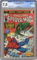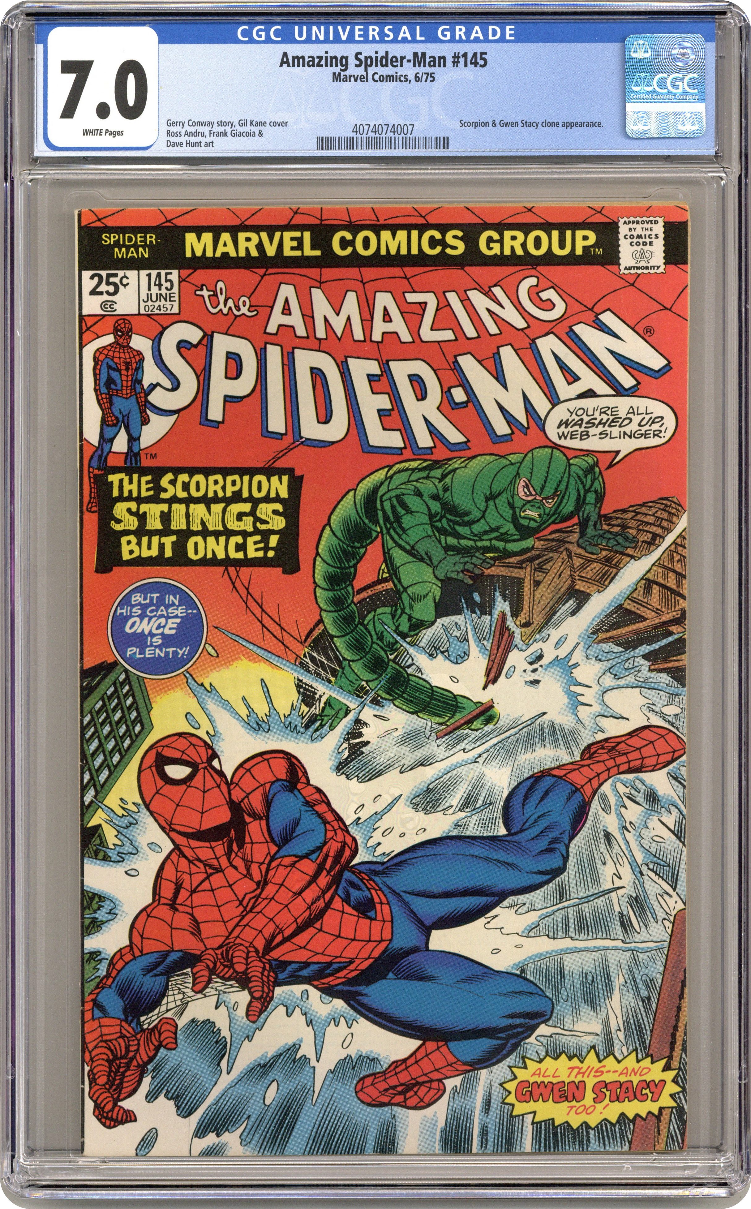 "Gwen Stacy is Alive...and, Well...?!" Part 1 of 2. Script by Gerry Conway. Pencils by Ross Andru. Inks by Frank Giacoia and Dave Hunt (backgrounds). Cover by Gil Kane and John Romita. Peter Parker's world has turned upside down! Gwen Stacy is alive! Aunt May is in the hospital! And the Scorpion is on the loose! After confronting Gwen and calling her an imposter, Peter rushes to the hospital to see his aunt! Fortunately, Aunt May's condition has stabilized; so, the restless web-slinger can leave her side...and find the nearest super-villain to pound! Ironically, the deadly Scorpion is in the vicinity and looking for a good scrap too! At a nearby cement processing plant, both men get their wish! The Amazing Spider-Man vs. the sinister Scorpion! A terrific fight! Cameo appearances by Anna Watson, Ned Leeds, Betty Brant, Joe Robertson, and Mary Jane Watson. Flashback cameo by the Green Goblin (aka Norman Osborn). (Note: The plot crosses over with Marvel Team-Up 33). The Scorpion previously appeared in Captain America 152. The letters page includes Marvel Value Stamp series A #100 Galactus by Jack Kirby. This story was reprinted in Marvel Tales 122. 36 pages. 25c cover price. Cover price $0.25. Grade: CGC 7.0 explanation of grade Condition: Used (collectible)