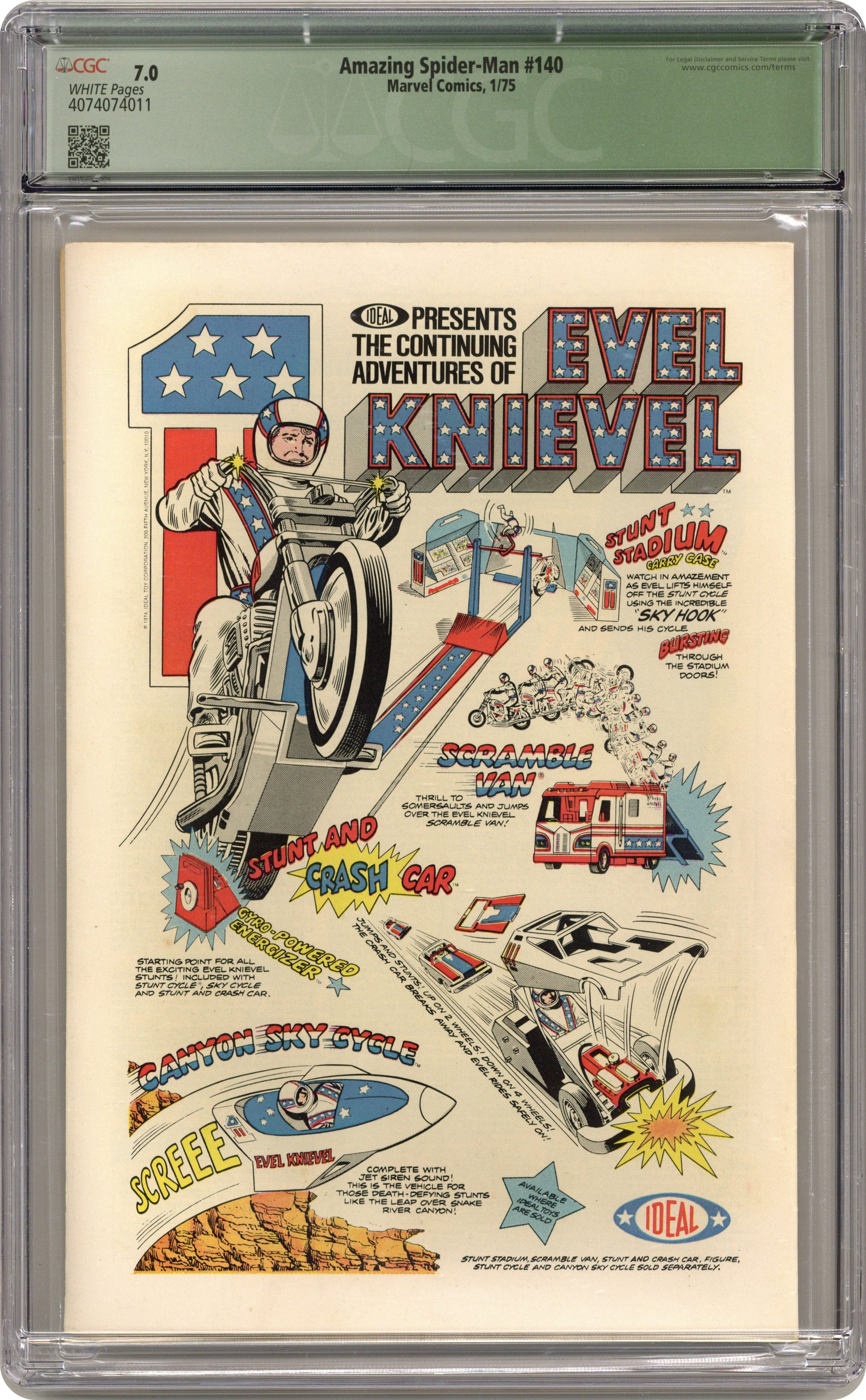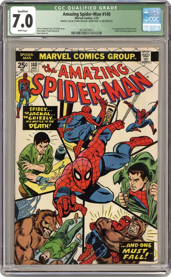 "...And One Will Fall" Part 2 of 2. Script by Gerry Conway. Pencils by Ross Andru. Inks by Frank Giacoia and Dave Hunt (backgrounds). Cover by Gil Kane and Mike Esposito. The conniving Jackal lures the wall-crawlers alter-ego into an ambush at Washington Square! And then attaches a metal harness to his arm! The spectacular one's spider powers won't get him out of this jam! It's up to his brainpower! Later on though the web-slinger will call upon all of his speed, strength, and agility to declaw the Grizzly! Origin of the Grizzly. Cameo appearances by Betty Brant, Ned Leeds, Flash Thompson, J. Jonah Jameson, and Glory Grant (first appearance). Flashback cameos by Liz Allan and Joe Robertson. (Notes: The Grizzly returns many years later in Web of Spider-Man 58. This issue contains a full-page ad for the second issue of Marvel Treasury Edition (1974) featuring the Fantastic Four. The letters page includes Marvel Value Stamp series A #75 Morbius by Pablo Marcos. This story was reprinted in Marvel Tales 117.) 36 pages. 25c cover price. Cover price $0.25. Grade: CGC 7.0 explanation of grade Condition: Used (collectible)