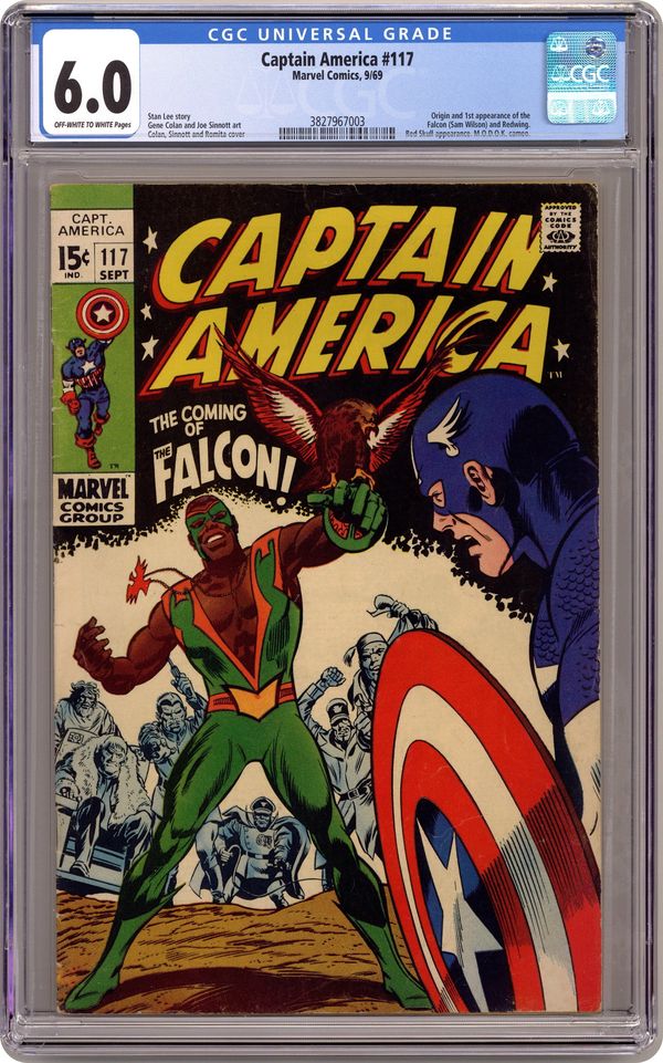 Ended Apr 18 2024 Winning Bid $212 Cover pencils by Gene Colan and John Romita (alterations), inks by Joe Sinnott and John Romita (alterations). First appearance and origin of the Falcon in "The Coming of... the Falcon!", script by Stan Lee, pencils by Gene Colan, inks by Joe Sinnott; With the Red Skull previously having switched bodies with Captain America, the Skull uses the Cosmic Cube to send Cap to the tropical island home of the Exiles; There Cap encounters a falconer from Harlem who had been hired by the Exiles but who is now attempting to help the island natives kick the Exiles from their home; Cap joins forces with the falconer who, with Cap's urging, dons a costume and takes the name the Falcon. Letter to the editor from writer James Van Hise. 36 pgs., full color. $0.15. Cover price $0.15. Grade: CGC 6.0 explanation of grade Condition: Used (collectible)