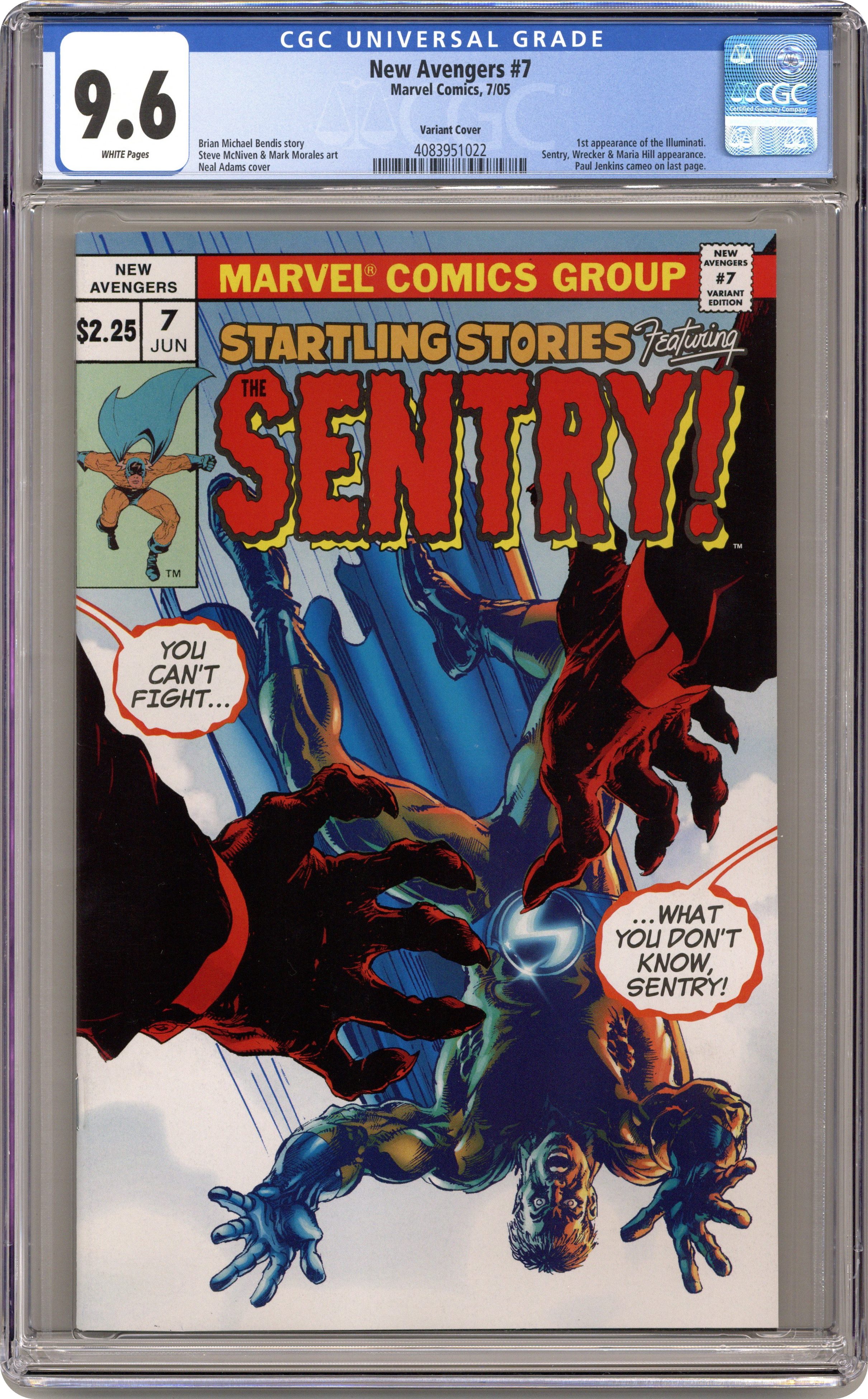 Ended Mar 8 2024 Winning Bid $24 Limited Edition Variant Cover by Neal Adams The Sentry: Part 1 of 3 - Written by BRIAN MICHAEL BENDIS Penciled by STEVE MCNIVEN Cover by Neal Adams. David Finch takes a well-deserved nappy time to give Young Gun guest artist Steve McNiven a moment to shine. The mysteries and tragedies of the Sentry come to the forefront as the New Avengers come to his aid. Who is behind the Sentry's tragic life? The answer WILL SHOCK YOU! 32 PGS./Marvel PSR NOTE: 1st appearance of the Illuminati (a secret group comprised of Iron Man, Mister Fantasic, Namor, Professor X, Doctor Strange, and Black Bolt). Cover price $2.25. Grade: CGC 9.6 explanation of grade Condition: Used (collectible)
