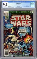 1st printing, standard 35 Cent Newsstand Edition with UPC. A New Hope: Part 5 of 6. "Lo, the Moons of Yavin!" Based on the screenplay by George Lucas. Adapted by Roy Thomas. Art by Howard Chaykin and Steve Leialoha. Luke does not have long to mourn the loss of Ben Kenobi as the Millennium Falcon is attacked from all sides by deadly Tie-Fighters. Even if these Rebel heroes do survive this latest attack, the Empire knows the location of the Rebel's secret headquarters. They don't have long before the Death Star, a space station with the power to destroy planets, delivers the killing blow to the rebellion once and for all. Cover price $0.35. Grade: CGC 9.4 explanation of grade Condition: Used (collectible)
