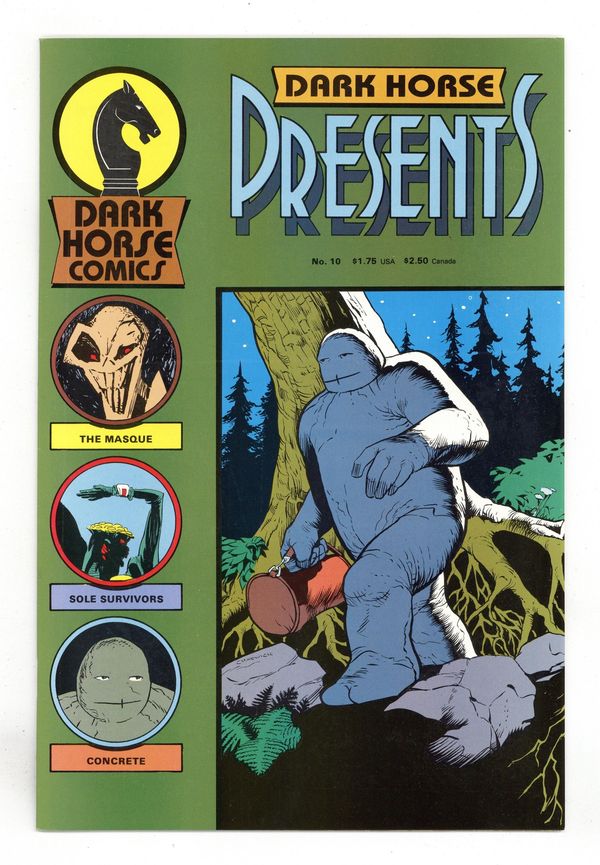 An anthology of original stories. Cover by Paul Chadwick. Straight in the Eye, script and art by Paul Chadwick; Concrete has agreed to help a man look for his lost brother who's last location was in the woods; The man's brother (Adam) is a stuntman who often takes enough fuel to fly and sleeps under the wing of his biplane. Masque (Part 1), script and art by Mark Badger; Two men arguing in a church in Manhattan about a man named Montoya; Cut to Newark airport where a group of what are assumed F.B.I agents are trying to find Montoya, after some squabbling he is apprehended but it turns out it's the wrong man; Montoya is then spotted and is chased into a bizarre room; The Masque appears and is subsequently shot. Sole Survivors, script by Randy Stradley, art by Tony Salmons; An Alien takes cover behind a rock and is in a Mexican standoff with another lone alien. 36 pgs., B&W. $1.75. Cover price $1.75. Grade: VF 8.0 explanation of grade Condition: Used (collectible)