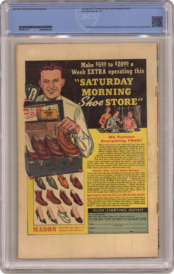 Ended Jul 10 2024 Winning Bid $601 Quicksilver, Scarlet Witch, Mastermind, and Toad appear for the 1st time, and Magneto makes his 2nd appearance. Cover pencils by Jack Kirby. The Brotherhood of Evil Mutants!, script by Stan Lee, pencils by Jack Kirby, inks by Paul Reinman; Magneto and his new Brotherhood of Evil Mutants steals a freighter and uses it to take over the South American nation of Santo Marco; The X-Men invade and take the country back; Xavier is caught in an explosion and loses his mental powers. 36 pgs. Cover price $0.12. Grade: CBCS 2.0 explanation of grade Condition: Used (collectible)