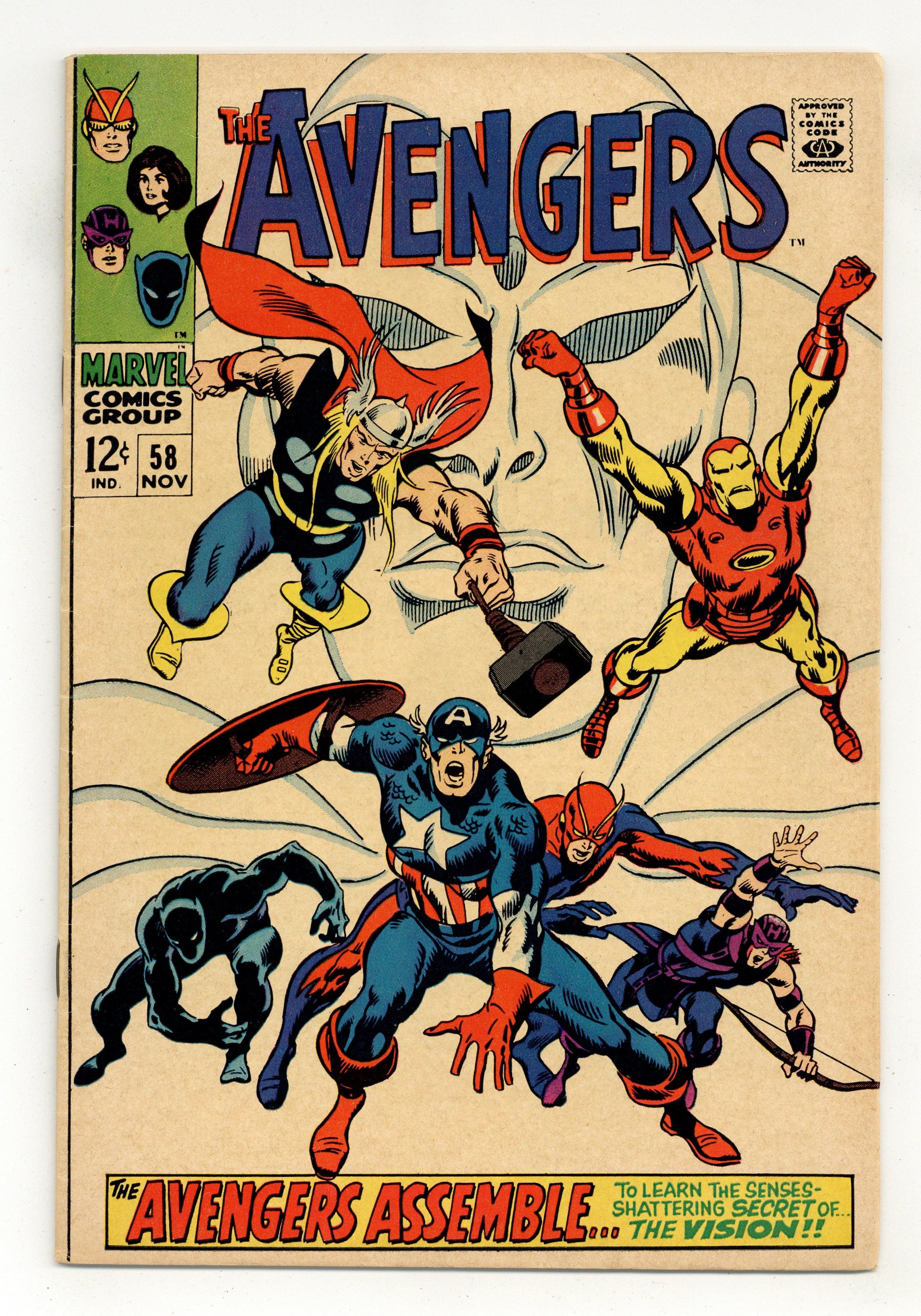 "Even An Android Can Cry" Part 2 of 2. Origins of the Vision and Ultron. Script by Roy Thomas. Pencils by John Buscema. Inks by George Klein. Cover by John Buscema and George Klein. The Vision wants to become an avenger! But before Goliath and the Wasp can add him to the roster, they must consult the old guard first! When Captain America, Iron Man, and Thor arrive at Avengers Mansion; they test the Vision's powers! And the three stalwarts are suitably impressed! But they also want to know the Vision's background story. Where did he come from and how was he created? As the Vision recounts his earliest memories, Hank Pym begins to connect the dots.Earth's Mightiest Heroes rush to Hank's suburban lab... where they learn the shocking truth about their newest ally: the Vision; and their newest enemy: Ultron! Does the truth clear the way for the Vision to join the Mighty Avengers? An uplifting story! Second appearance of the silver age Vision. Flashback cameos by the Enchantress, Executioner, Baron Zemo, Wonder Man, and Ultron. Avengers Lineup: Black Panther, Captain America, Goliath, Hawkeye, Iron Man, Thor, and the Wasp. (Notes: Roy Thomas and John Buscema's creations of the Vision and Ultron set the stage for decades of great Avengers stories. This issue features a full-page panel (page 9) of all the avengers to date plus Spider-Man. This two-part story was reprinted in 1986 in the Marvel Illustrated paperback: Avengers, The Origin of The Vision. This issue was reprinted in Marvel Super Action #19.) 36 pages. Cover price $0.12. Grade: FN- 5.5 explanation of grade Condition: Used (collectible)