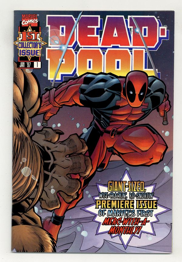 "Hey, It's Deadpool (or...Deadpool #1)" Written by Joe Kelly. Pencils by Ed McGuinness. Inks by Nathan Massengill and Norman Lee. Cover pencils by Ed McGuinness, and inks by Nathan Massengill. After assisting a revolution in Bolivia (and getting paid in revolutionary bucks), Deadpool heads back to merc central to have words with Patch; Pool's next mission takes him to Antarctica to tangle with Sasquatch and blow up a gamma research station in the process; Finding out that the melting gamma core will irradiate the entire southern hemisphere, Deadpool fixes the problem and saves the day; DP is approached by Zoe and Noah and offered a position with Landau, Luckman and Lake but he quickly turns them down as being a good guy isn't exactly his style. Behind the Scenes text article: A look at the making of the issue including script fragmants, rough pencils, cover process and character designs. Promo of Generation X material. Cover price $2.95. Grade: VF- 7.5 explanation of grade Condition: Used (collectible)