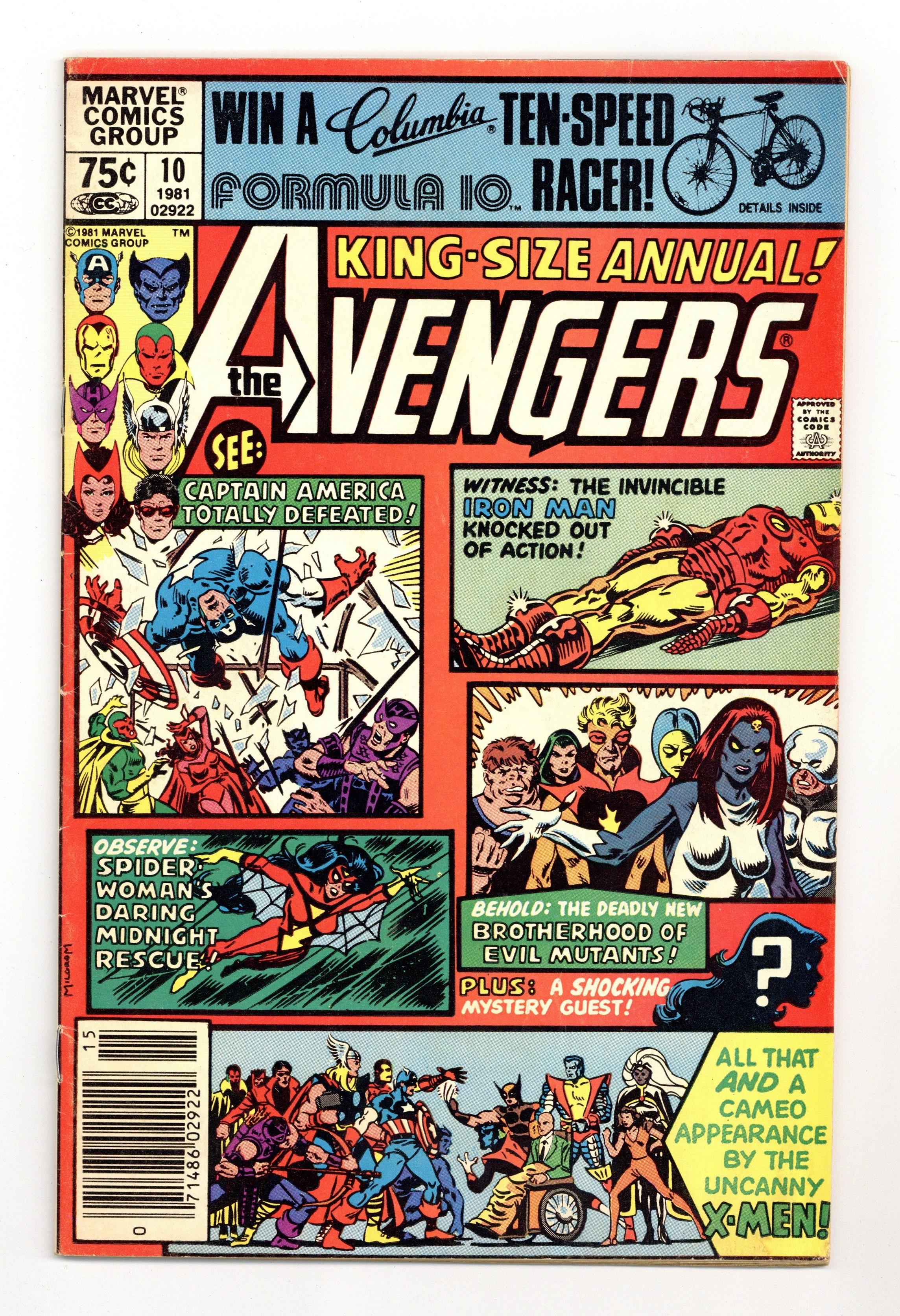 Direct Edition. First appearance of Rogue and Madelyne Pryor in "By My Friends Betrayed!" Spider-Woman, X-Men, Carol Danvers, and New Brotherhood of Mutants guest star. Script by Chris Claremont. Pencils by Michael Golden. Inks by Armando Gil. Cover by Al Milgrom. This action-packed annual has got it all, true believers: the first appearance of Rogue, the spectacular art of Michael Golden, the tragic return of Carol Danvers, and the stupendous struggle between the Brotherhood of Evil Mutants and the mighty Avengers! Following the events of Uncanny X-Men #142, Mystique & her New Brotherhood of Evil Mutants attempt to break four of their members out of Ryker's Island prison! After Rogue and Mystique take down Captain America, Iron Man, and Thor, the rest of the Avengers and Spider-Woman catch up to the villains, and the epic clash erupts! Woven in and around the frantic action at Ryker's Island is the heartbreaking story of Carol Danvers' return to Earth. Her life has fallen apart since leaving for Limbo with Marcus Immortus in Avengers #200, and now, stripped of her powers and memories, Carol begins the long road to recovery. And the first step is an emotional confrontation with her former teammates! Notes: Marvel Super-Heroes #11 (Fall 1992) fills in the details of Carol Danvers' life between Avengers #200 and Avengers Annual #10. The Thing stars in a one-page Hostess ad, "A Lesson to Be Learned!" This issue was reprinted in 1993 in the trade paperback: The Greatest Battles of the Avengers. 52 pages, full color. Cover price $0.75. Grade: VG- 3.5 explanation of grade Condition: Used (collectible)