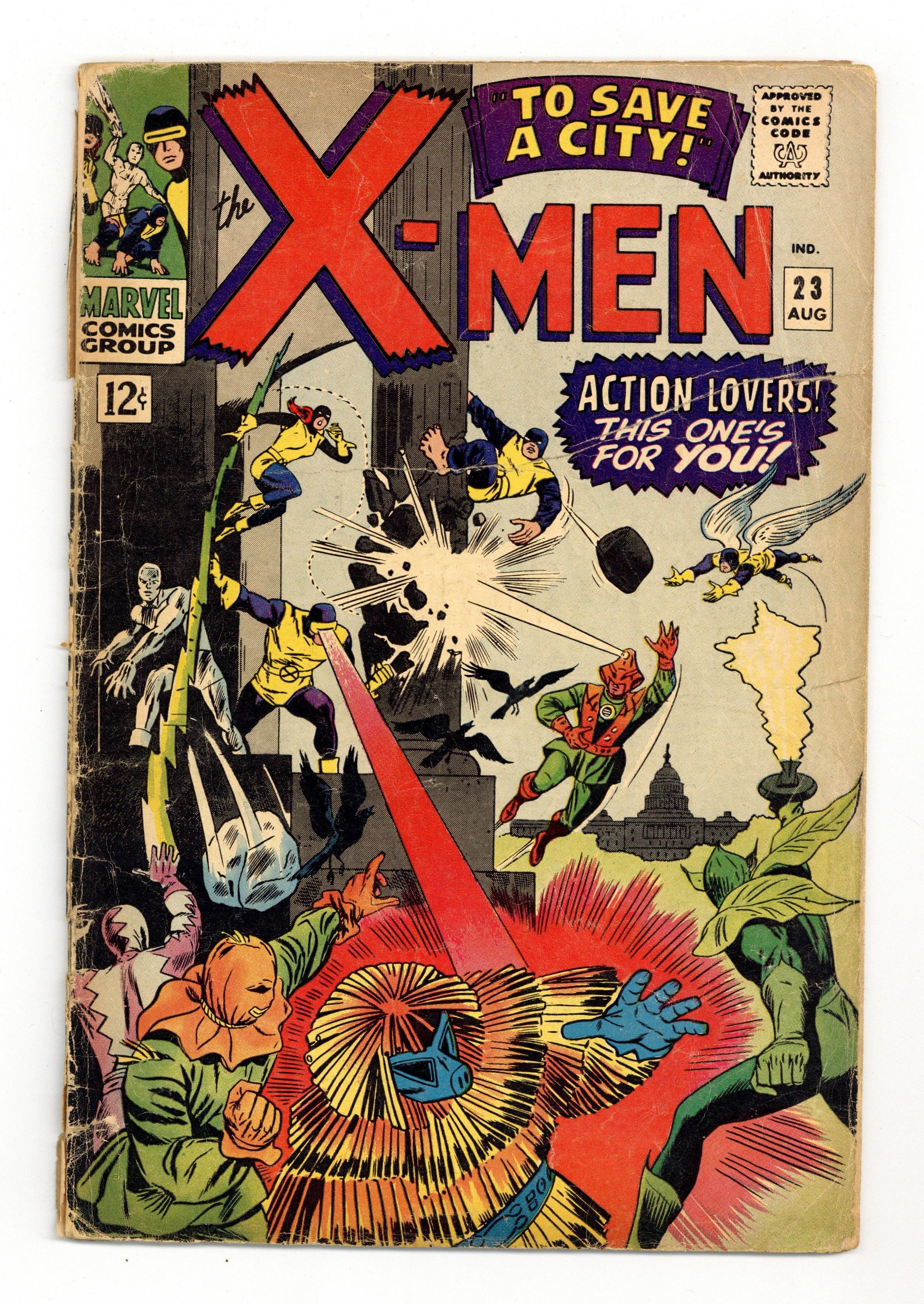 Cover pencils by Werner Roth, inks by Dick Ayers. To Save a City, script by Roy Thomas, pencils by Werner Roth, inks by Dick Ayers; Count Nefaria, the Plantman, the Scarecrow, the Porcupine, the Eel, and the Unicorn continue their attack; Professor X walks with the aid of metal braces. 36 pgs. $0.12. Cover price $0.12. Grade: FR 1.0 explanation of grade Condition: Used (collectible)