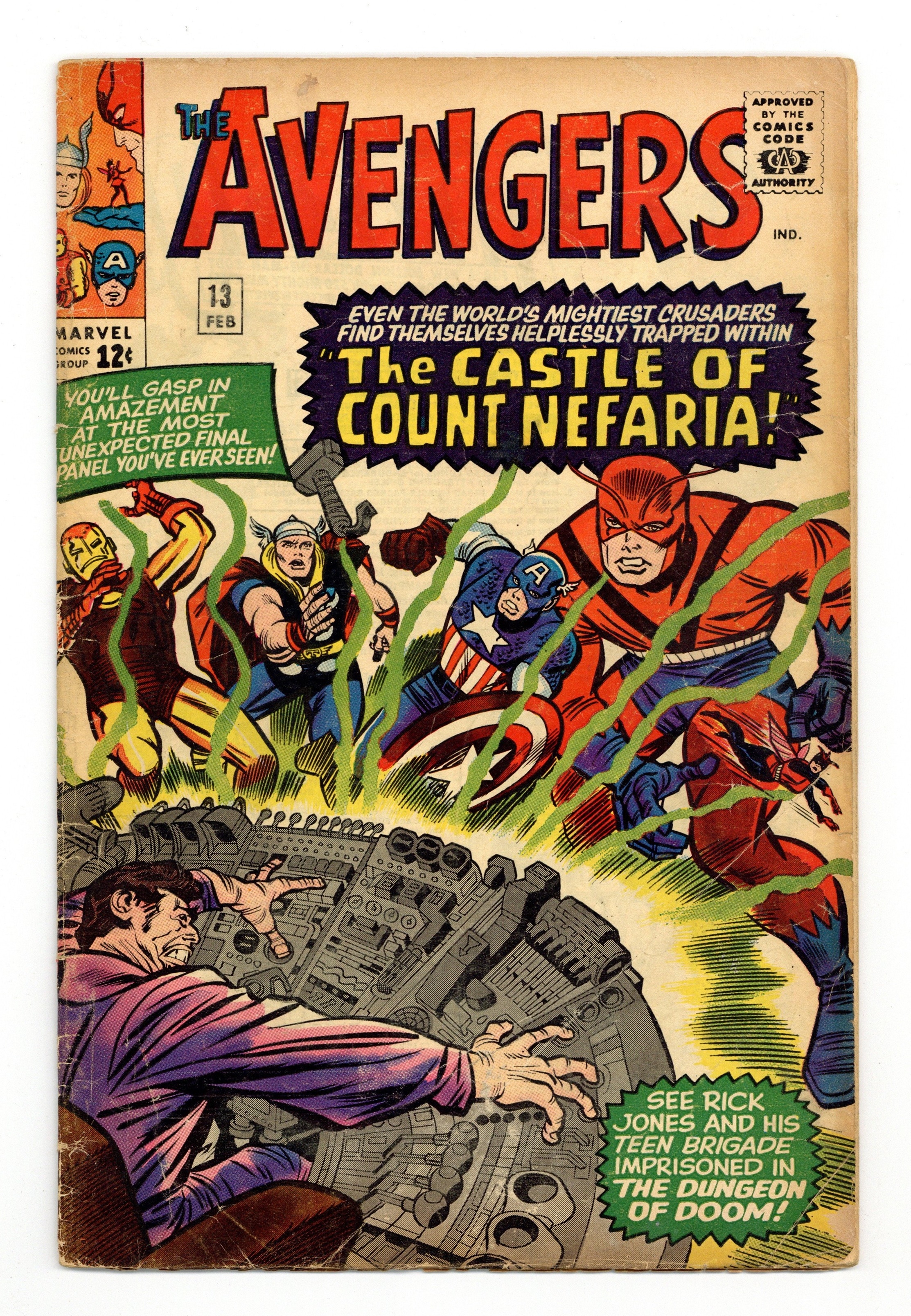 Cover pencils by Jack Kirby, inks by Chic Stone. "Trapped in... The Castle of Count Nefaria!", script by Stan Lee, pencils by Don Heck, inks by Dick Ayers; When Count Nefaria, the head of the crime organization known as the Maggia, moves his European castle to New Jersey, he invites the Avengers to be his guests at the castle's opening day; However, he then creates duplicates of the Avengers who go to Washington DC to take over the government. Avengers Roll Call: Captain America, Thor, Iron Man, Wasp, Giant Man, and Rick Jones. First appearance of Count Nefaria and the Maggia. Guest appearance by the Fantastic Four. First appearance of the Avengers Emergency Headquarters. Reprinted in Marvel Triple Action #7. 36 pgs., full color. $0.12. Cover price $0.12. Grade: GD+ 2.5 explanation of grade Condition: Used (collectible)