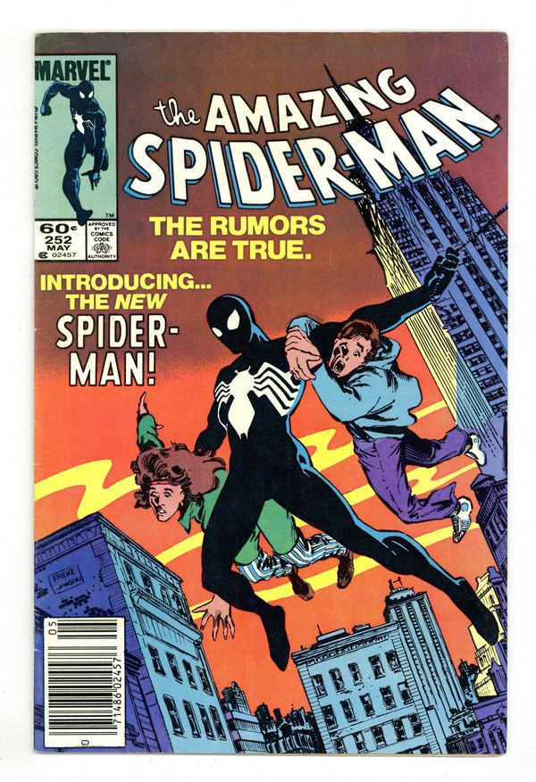 Newsstand Edition. First appearance of Spider-Man's new black (alien symbiote) costume in "Homecoming!" Plot by Roger Stern. Script by Tom DeFalco. Pencils by Ron Frenz (breakdowns) and Brett Breeding (finishes). Cover by Ron Frenz and Klaus Janson. One of the landmark issues of the Amazing Spider-Man! With a brilliant flash of light in Central Park, the wondrous wall-crawler is back! And he looks a whole lot different! Wow, a new costume! What happened during the Secret Wars on the Beyonder's world? The ominous truth will be revealed to both the readers and the web-slinger in the days and weeks ahead! Cameo appearances by the Black Cat, Dr. Curt Connors, J. Jonah Jameson, Joe Robertson , Aunt May, Captain America, Captain Marvel, Hawkeye, Iron Man, Thor, and the Wasp. (Notes: Marvel Age 12 contained sketches of the new costume two months prior to the publication of this issue. Spidey's new costume was also unveiled in Marvel Team-Up 141 and Spectacular Spider-Man 90. The first issue of the (1984) Marvel Super Heroes Secret Wars Limited Series was published the same month as Amazing Spider-Man 252. The web-slinger discovers his new costume in issue 8 of the limited series. The Frenz-Janson cover is a tribute to the iconic cover of Amazing Fantasy 15. This story was reprinted in Marvel Tales 266. The letters page contains a statement of ownership: average print run 470,527; average paid circulation: 241,762. 36 pgs. Cover price $0.60. Grade: VG+ 4.5 explanation of grade Condition: Used (collectible)