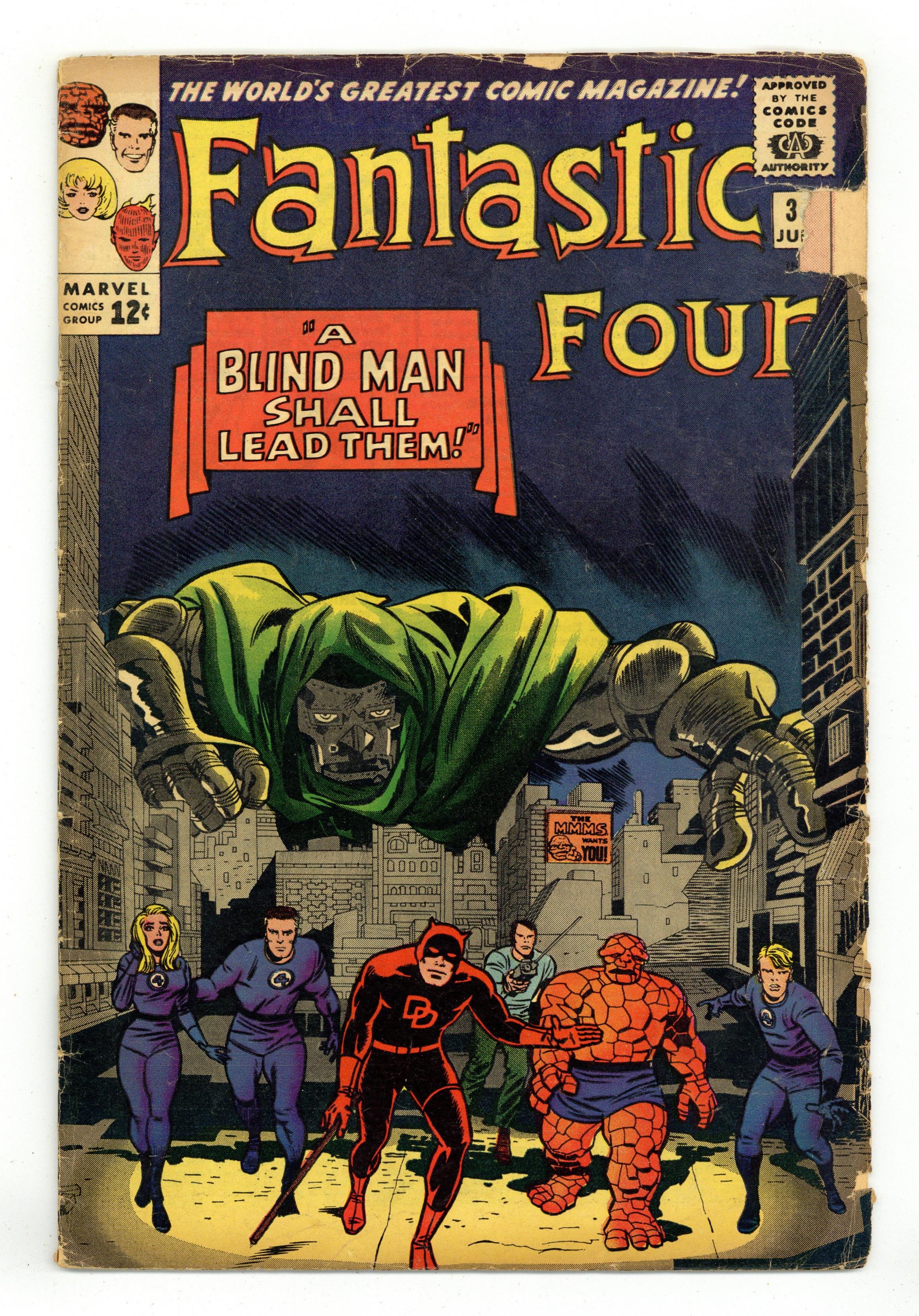 Cover pencils by Jack Kirby, inks by Chic Stone and Wally Wood (on Daredevil figure). A Blind Man Shall Lead Them!, script by Stan Lee, pencils by Jack Kirby, inks by Frank Giacoia [as Frank Ray] and Wally Wood (Matt Murdock and Daredevil figures); Reed devises mechanical devices to enable the FF to duplicate their vanished super-powers; Matt Murdoch visits the FF and Dr. Doom attacks; Daredevil assists the FF in battling Doom. Cameos by Medusa, the Wizard, the Sandman, and the Trapster. 36 pgs. $0.12. Cover price $0.12. Grade: GD 2.0 explanation of grade Condition: Used (collectible)