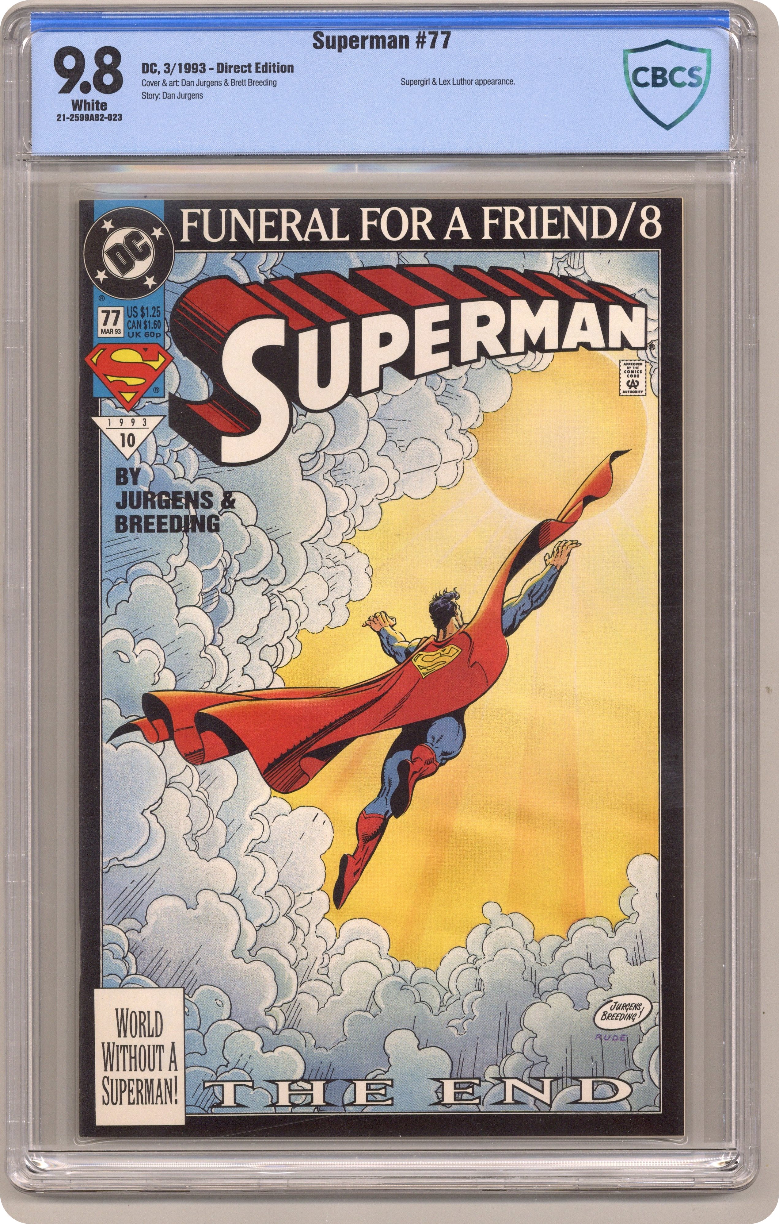 1st printing. Funeral for a Friend. Part 8 of 8. "The End!" Story by Dan Jurgens. Art by Dan Jurgens and Brett Breeding. Story continued from Superman: The Man of Steel #21. The Kents were the first to find the infant Kal-el when he arrived on Earth. They took him in and raised him as their own. This issue explores a father's grief. It's never easy when a parent outlives their child. It gets even worse when this grief causes Jonathan Kent to have a heart attack. Plus, Lex Luthor's epitaph to his fallen enemy. Cover price $1.25. Grade: CBCS 9.8 explanation of grade Condition: Used (collectible)