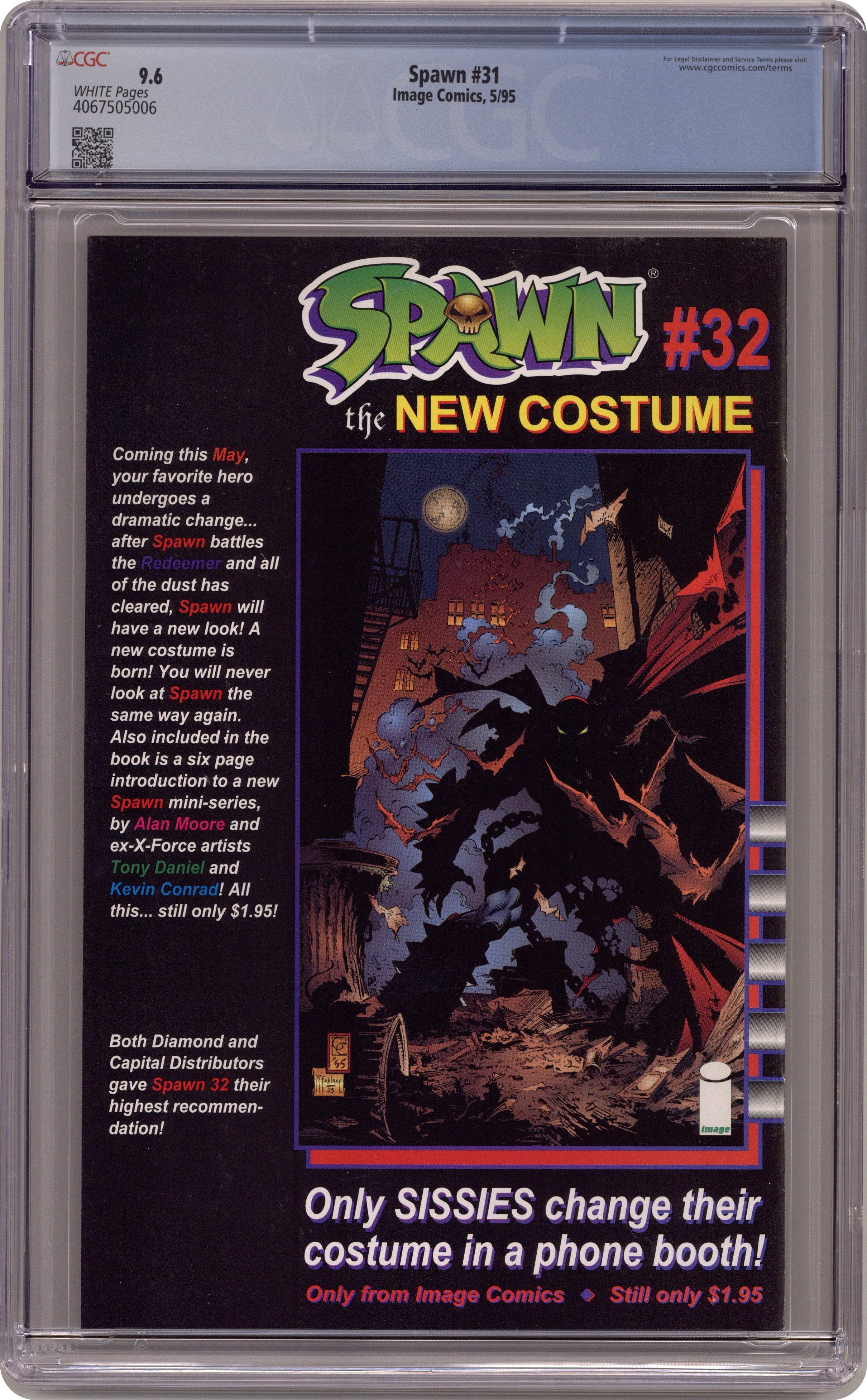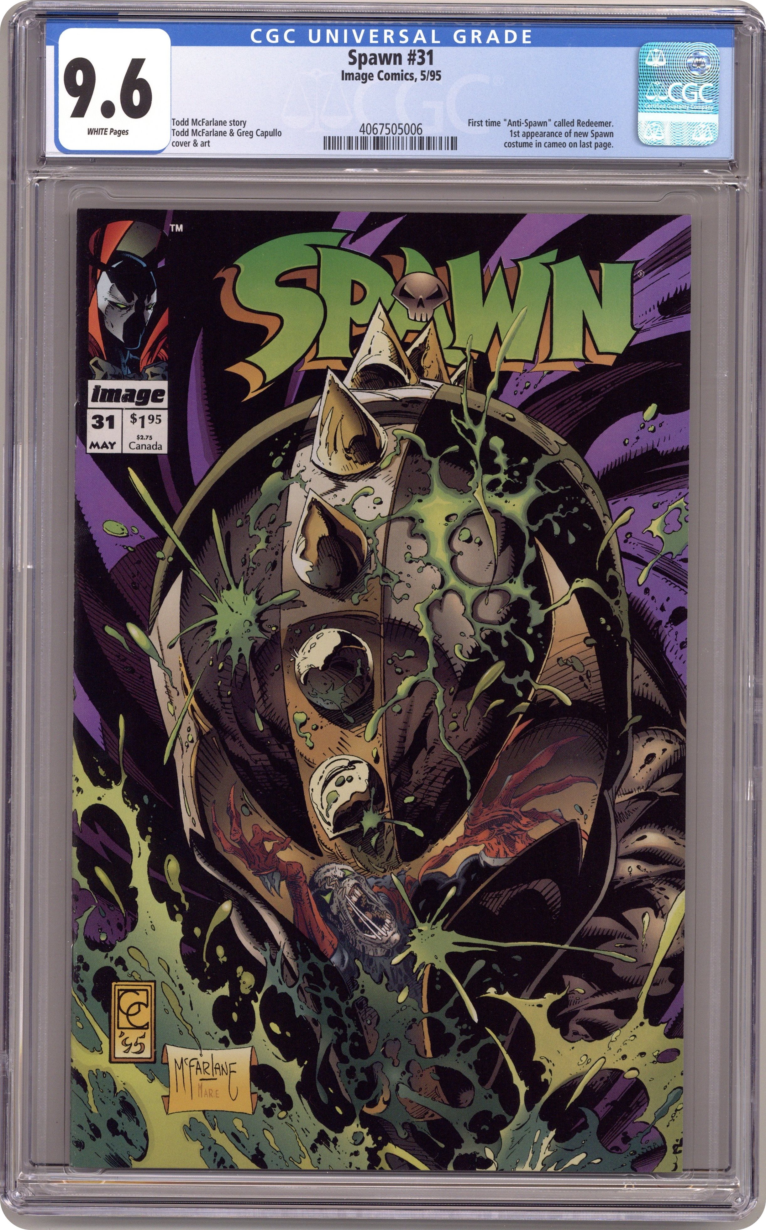 Direct Edition (has no bar code on cover). "The Homecoming!" Story by Todd McFarlane. Art by Greg Capullo and Todd McFarlane. Finally, Spawn has returned to New York City and his alleyways he calls home. But his homecoming joy is cut short when the Anti-Spawn, now called the Redeemer, returns for Round 2! Their battle leaves Spawn at the brink of death. Now it's time for Spawn's living costume to take charge. Includes 2 Spawn pin-ups. Cover price $1.95. Grade: CGC 9.6 explanation of grade Condition: Used (collectible)