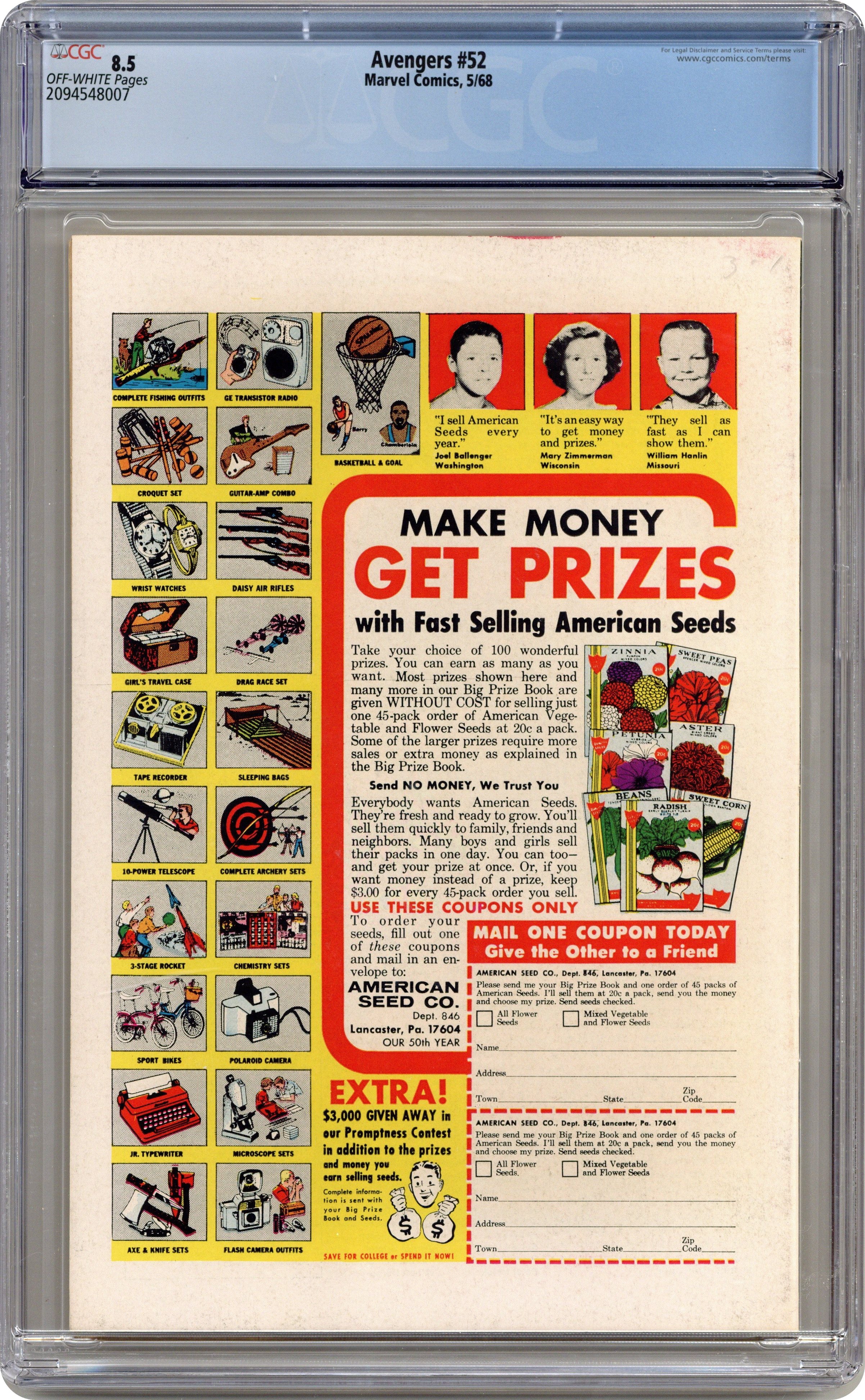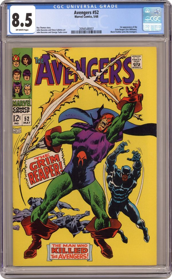 Ended Jan 21 2024 Winning Bid $188 First appearance of the Grim Reaper in "Death Calls for the Arch-Heroes!" Script by Roy Thomas. Pencils by John Buscema. Inks by Vince Colletta. Cover by John Buscema. The Black Panther arrives at Avengers Mansion ready to join Earth's Mightiest Heroes! However when T'Challa reaches the main meeting room, he finds his three would-be teammates lying on the floor unconscious! The panther begins to render first aid, but Jasper Sitwell suddenly appears and arrests him for murder! While being transported to and questioned at the local police station, T'Challa puts the evening's strange pieces together! And the newest avenger rushes back to the mansion to face the true perpetrator! Wow, the Black Panther vs. the Grim Reaper! What a debut for the superhero and the super-villain! Cameo appearances by the Black Widow, Tony Stark, Captain America, and Thor. Flashback cameo by Wonder Man to recap the events of Avengers #9. Avengers Lineup: Black Panther, Goliath, Hawkeye, and the Wasp. (Notes: The Grim Reaper (aka Eric Williams) returns in Avengers #78 to continue his quest for revenge. The letters page includes a letter from comics writer Mike Uslan. This issue was reprinted in Marvel Triple Action #44.) 36 pages. Cover price $0.12. Grade: CGC 8.5 explanation of grade Condition: Used (collectible)