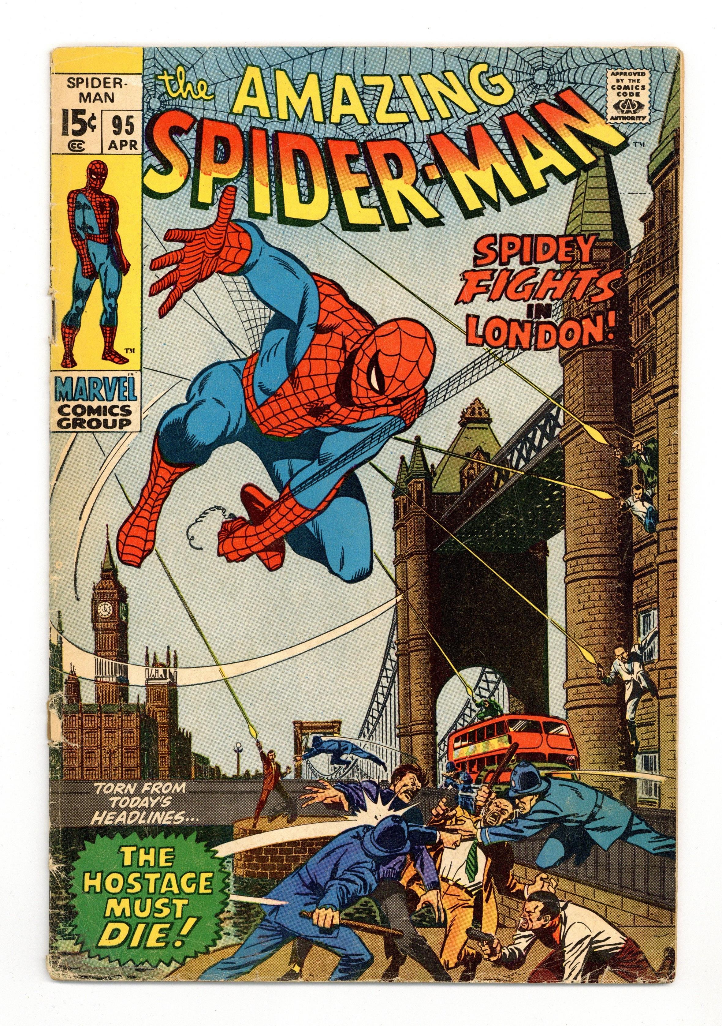 "Trap for a Terrorist!" Script by Stan Lee. Pencils by John Romita. Inks by Sal Buscema. Cover by John Romita and Sal Buscema. As a favor to the Daily Bugle's freelance photographer, Joe Robertson sends Peter Parker to England for a special assignment (and also to visit Gwen Stacy.) Aunt May's nephew is overjoyed about his business trip and quickly hops on an airplane bound for London. However also on the flight is a high-ranking American diplomat -- who is abducted by terrorists once the place lands at Heathrow Airport! Fortunately, Peter brought his familiar red and blue suit across the pond! And the Amazing Spider-Man swings into action from the Tower Bridge to the Big Ben Clock -- to save the American delegate! But will the web-slinger's much-publicized appearance in London derail Peter's plan to visit Gwen? Cameo appearances by J. Jonah Jameson, Aunt May, Anna Watson, Mary Jane Watson, Harry Osborn, Arthur Stacy, and Nancy Stacy. (Notes: This story was reprinted in Marvel Tales #76. The letters page includes a statement of ownership: average print run 596,102; average paid circulation 322,195.) 36 pages. Cover price $0.15. Grade: GD/VG 3.0 explanation of grade Condition: Used (collectible)
