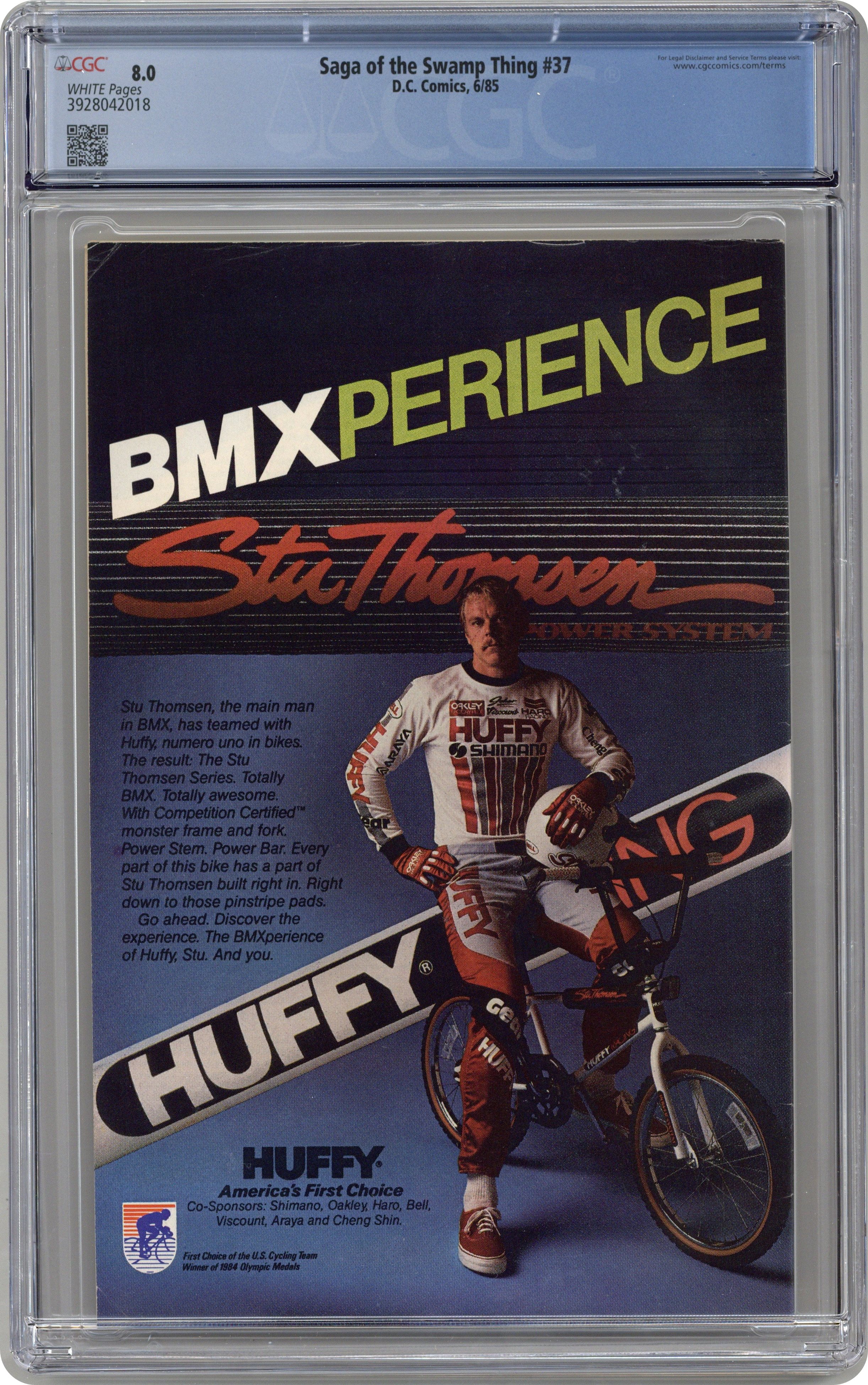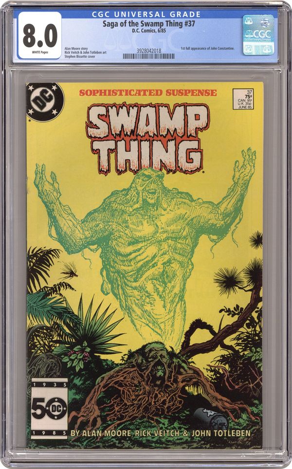 "Growth Patterns!" Written by Alan Moore, with art by Rick Veitch and John Totleben. Cover by Stephen Bissette and Totleben. New "Growth Patterns" and other strange abilities emerge in Swamp Thing as he fights for survival. NOTE: 1st appearance of John Constantine, Hellblazer. 36 pages, full color. Cover price $0.75. Grade: CGC 8.0 explanation of grade Condition: Used (collectible)