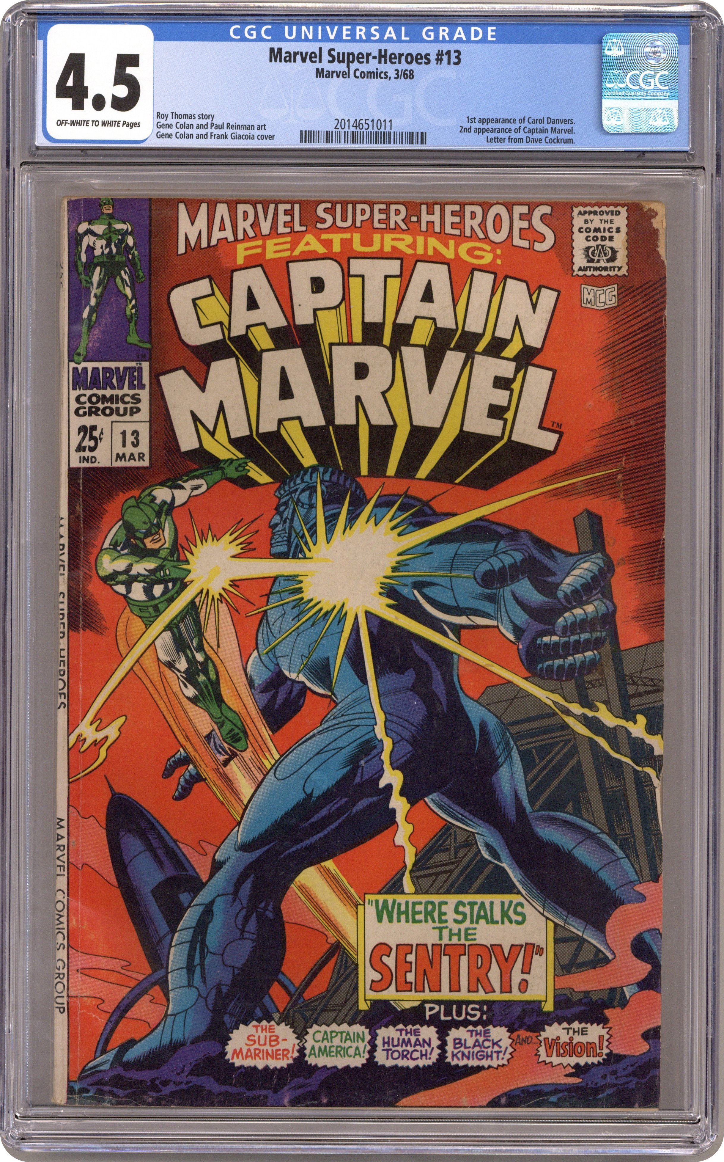Ended Oct 29 2023 Winning Bid $75 Giant-size issue. Captain Marvel stars in "Where Stalks the Sentry!" Script by Roy Thomas, pencils by Gene Colan, inks by Paul Reinman. The story continues in Captain Marvel 1 (1968). The remainder of the issue consists of Golden Age reprints: the Black Knight by Joe Maneely (1955), the Human Torch by Dick Ayers ("Fugitive at Large!"; 1954); the Vision (1941); Captain America by John Romita Sr. ("Top Secret!"; 1953); and the Sub-Mariner by Bill Everett ("Invasion!"; 1955). Letter to the editor from comic artist Dave Cockrum. Colan cover pencils. 1st Carol Danvers (pre Ms. Marvel). Cover price $0.25. Grade: CGC 4.5 explanation of grade Condition: Used (collectible)