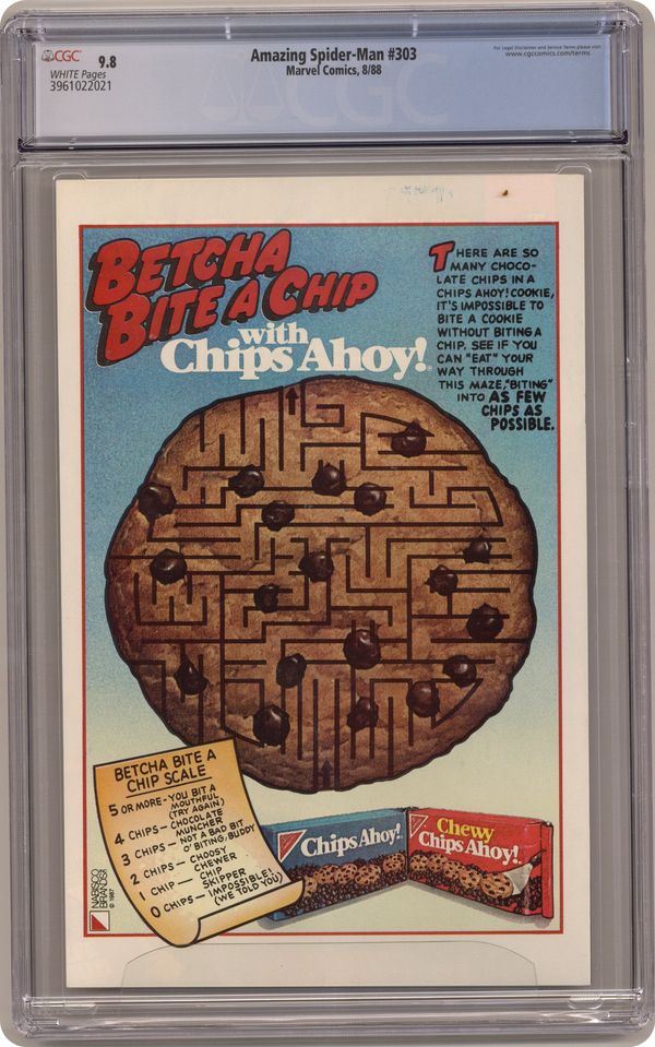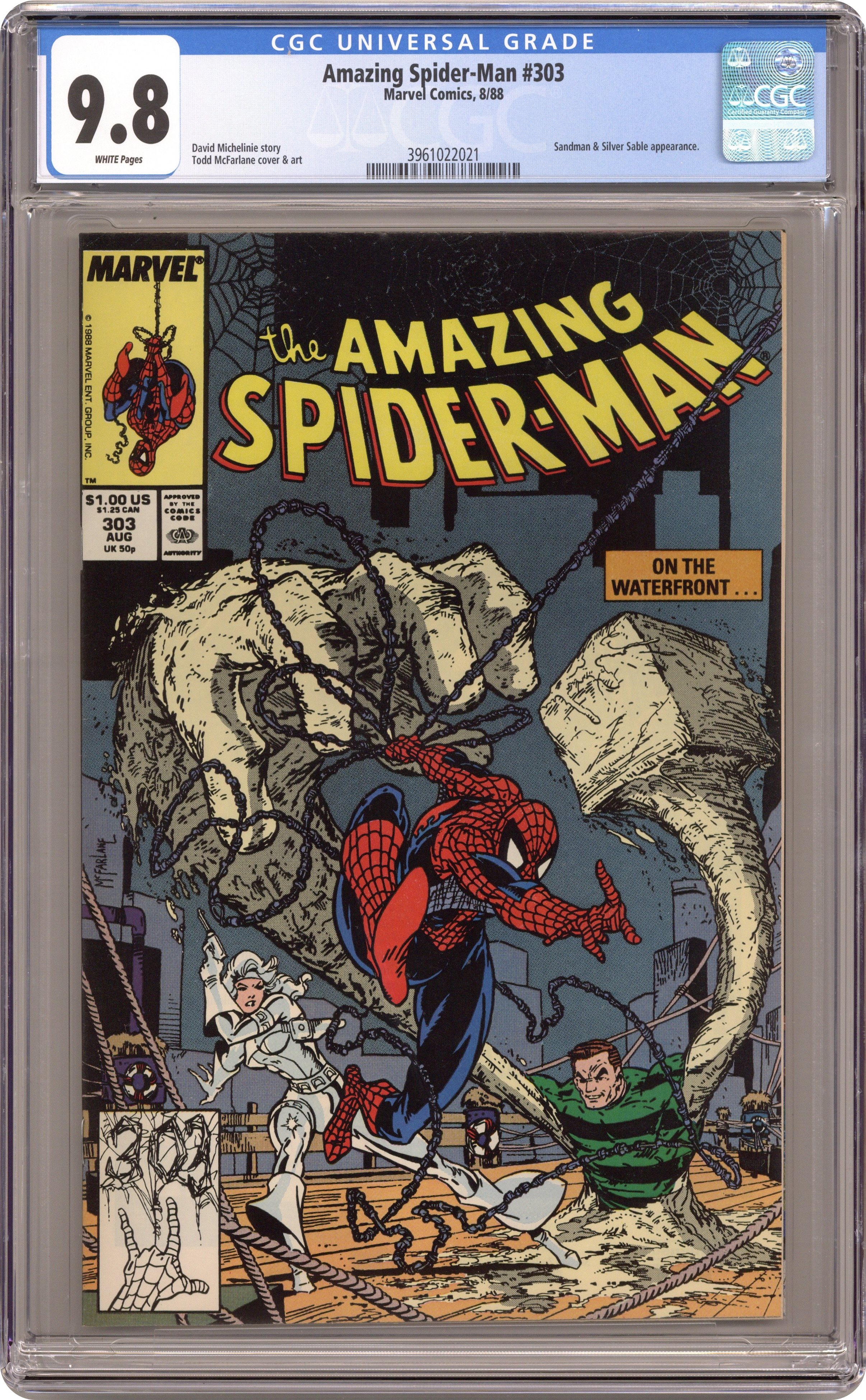 Direct Edition. "Dock Savage!" Guest-starring Silver Sable. Script by David Michelinie. Art by Todd McFarlane. Cover by Todd McFarlane. While trying to make up his mind about the research company's job offer in Kansas, the wondrous wall-crawler receives another employment offer! However, this one is from Silver Sable and requires brawn not brains! The Symkarian mercenary wants Spider-Man to team up with the Sandman to take down a neo-nazi and his private army! The web-slinger quickly accepts sable's offer and swings into action! As for the other offer, your friendly neighborhood Spider-Man has to talk to his wife first! Cameo appearances by Mary Jane Watson and J. Jonah Jameson. (Notes: Beginning with this issue, Todd McFarlane produces small drawings in the UPC box on the front cover. These sketches only appear on the cover of the direct sales issues. The newsstand editions have the regular bar code.) 36 pgs. Cover price $1.00. Grade: CGC 9.8 explanation of grade Condition: Used (collectible)